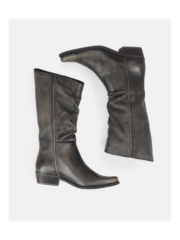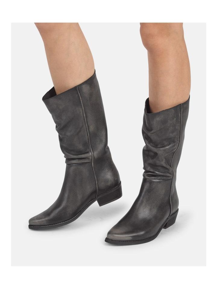 GERBERA E465 - кожаные ботинки средней длины с непринужденным дизайном, полным индивидуальности. Слегка гофрированное голенище и острый носок придают им особый характер, а низкий каблук обеспечивает повседневный комфорт. Эти ботинки, произведенные в Португалии, сочетают в себе стиль и универсальность, что делает их незаменимым предметом гардероба, идеально дополняющим любой повседневный образ.