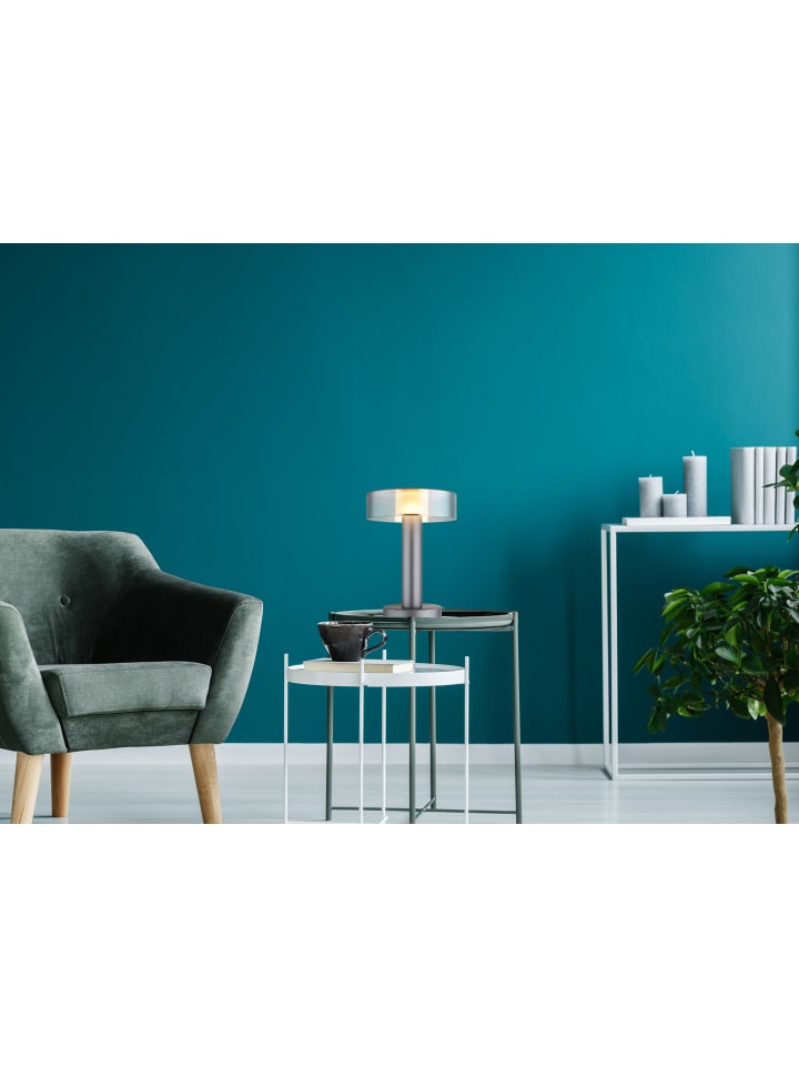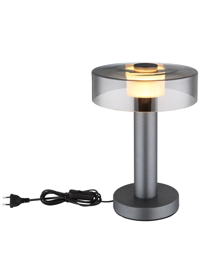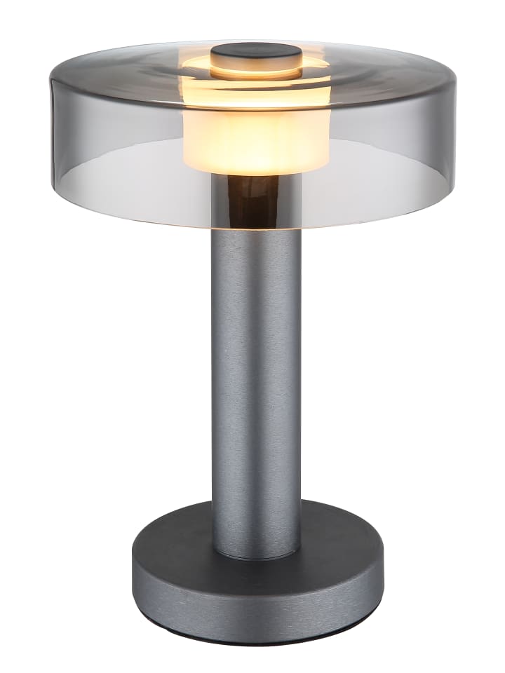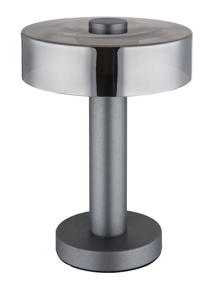 Настольная лампа, матовый серый алюминий, матовый серый металл, дымчатое стекло, сатинированный акрил, матовый черный пластик, черный кабель из ПВХ, клавишный выключатель на кабеле, ø: 220 мм, H: 310 мм, длина кабеля 1500 мм, в комплекте светодиод 8 Вт 230 В, источник света 950 лм, световой поток 320 лм, цветовая температура 3000 К
