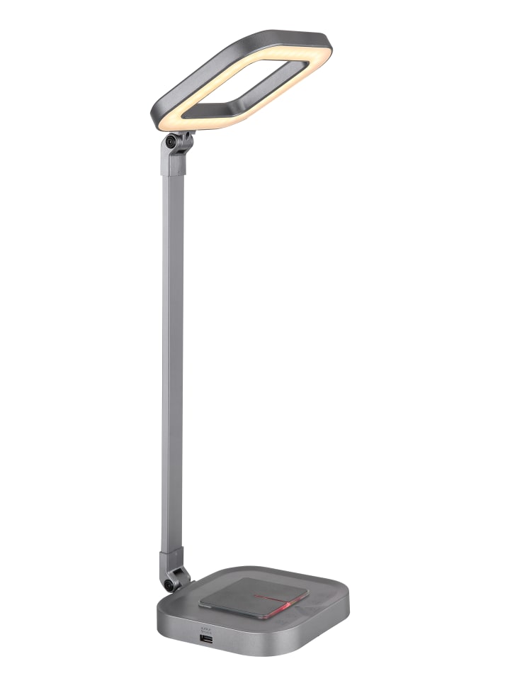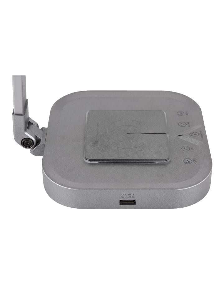 Настольная лампа, серый алюминий, серый пластик, белый пластик, сенсорное включение/выключение, регулировка яркости, сенсорный диммер, фиксация цветов, RGB-переключатель, 1 USB-выход, функция беспроводной зарядки, RGB-светодиоды в основании, ДxШxВ: 430x145x580 мм, длина кабеля 1500 мм, в комплекте светодиод 8 Вт 230 В, источник 850 лм, световой поток 500 лм, цветовая температура 2700/4000/6000 К, в комплекте светодиод RGB 1 Вт 230 В, разноцветный