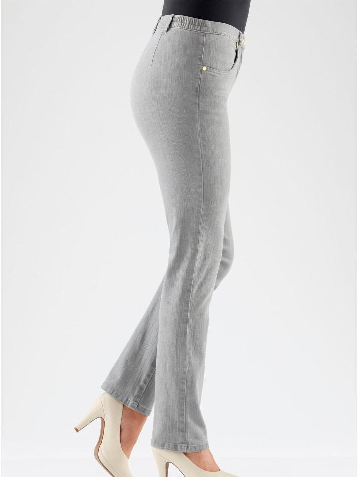 Джинсы с эластичным поясом сбоку, шлевками для ремня и застежкой на пуговицу и молнию спереди. Два закругленных кармана. Ремень в комплект не входит.