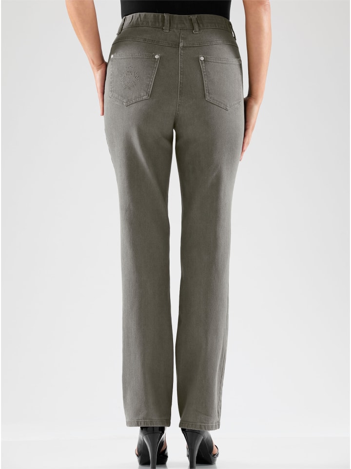 Джинсы с пятью карманами. Прямой крой. Удобны благодаря внутреннему «невидимому» эластичному поясу. 1 задний карман с вышивкой. Длина брючины примерно 40 см. Ремень в комплект не входит.