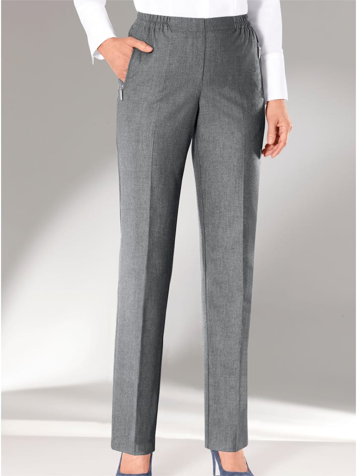 Удобные брюки с эластичным поясом, гладкий перед. Аккуратная заутюженная стрелка спереди и боковые карманы на молнии. Зимняя ткань с легким начесом. Длина брючины примерно 40 см.