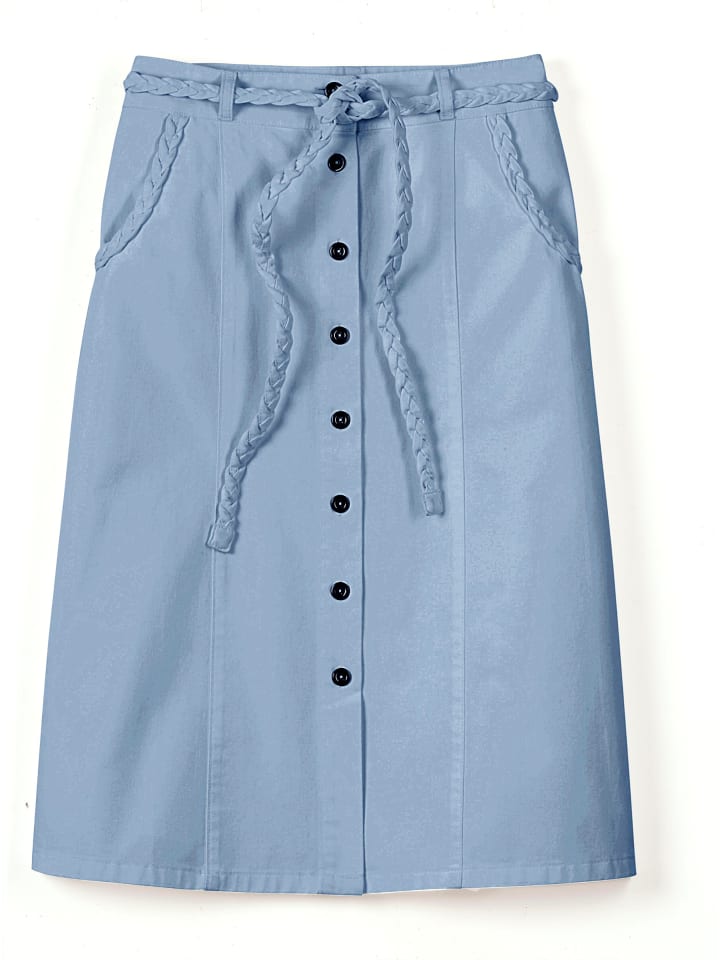 Юбка на пуговицах из джинсовой ткани со шлевками и плетеным поясом. Два кармана украшены узором «косички». Спереди разрез для свободы движений.