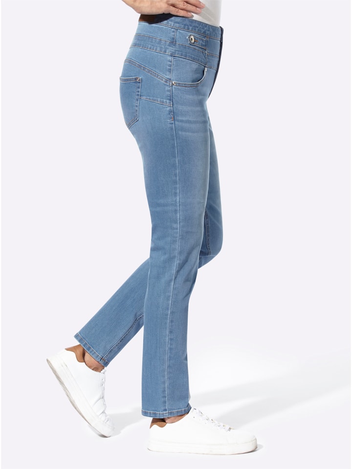 Мы уверены: это ваши новые любимые джинсы! Высокая талия гарантирует отличную посадку. Застежка на три пуговицы и молния спереди. Два боковых хлястика с пуговицами и привлекательная потертость добавляют стильный штрих. Детали включают два закругленных передних кармана и два накладных кармана сзади. Специальная конструкция швов создает эффект пуш-ап, создавая привлекательный силуэт. Длина брючины примерно 34 см. Ремень в комплект не входит. Поддерживает инициативу «Сделано в Африке из хлопка».