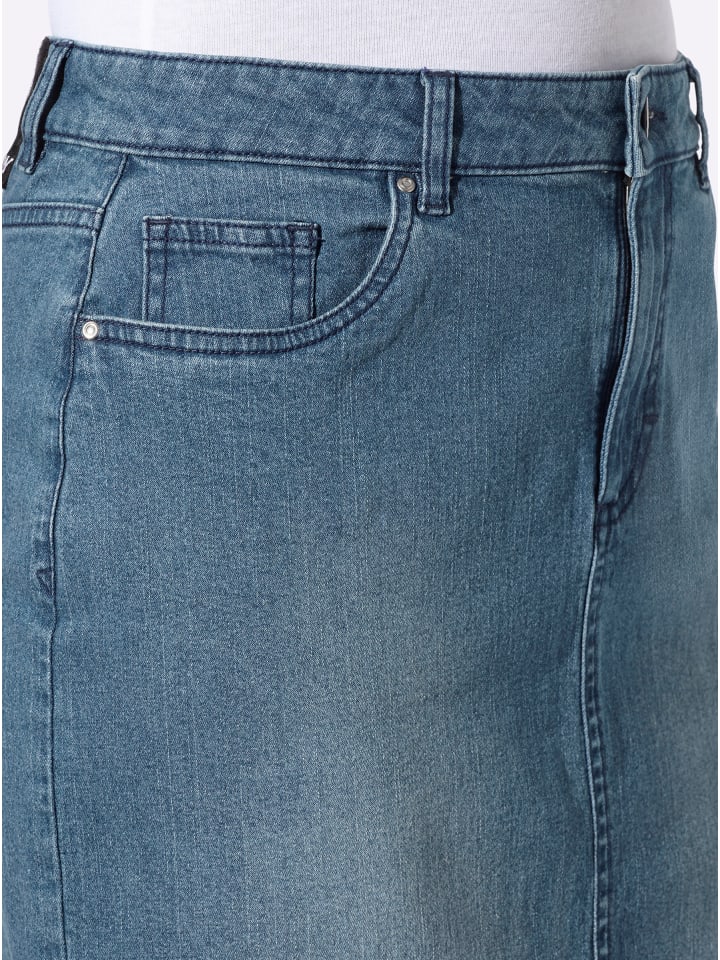 Модная джинсовая юбка в классическом, непринужденном стиле с пятью карманами. Нашивка Just Wow сзади на поясе со шлевками для ремня. Застежка на пуговицу и молнию, два передних кармана и дополнительный карман для монет. Передний шов создает эффект удлинения, а разрез обеспечивает оптимальную свободу движений. Сзади приталенная кокетка. Соответствует инициативе «Сделано в Африке» (Cat Cotton Made in Africa). Ремень в комплект не входит.
