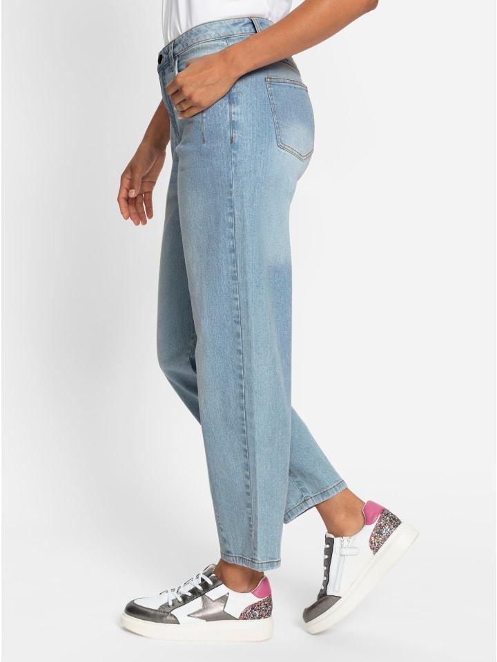 Джинсы модного мом-кроя с высокой талией и свободным кроем в области ягодиц, бедер и ягодиц. Фигурный пояс со шлевками для ремня, застежка на пуговицу и молнию спереди. Два передних кармана и карман для монет, а также два задних кармана. Регулируемая кокетка сзади. Швы в области брючин обеспечивают узкое обхват брючин. Соответствует инициативе «Сделано в Африке» (Cotton Made in Africa). Длина брючины около 34 см. Ремень в комплект не входит.