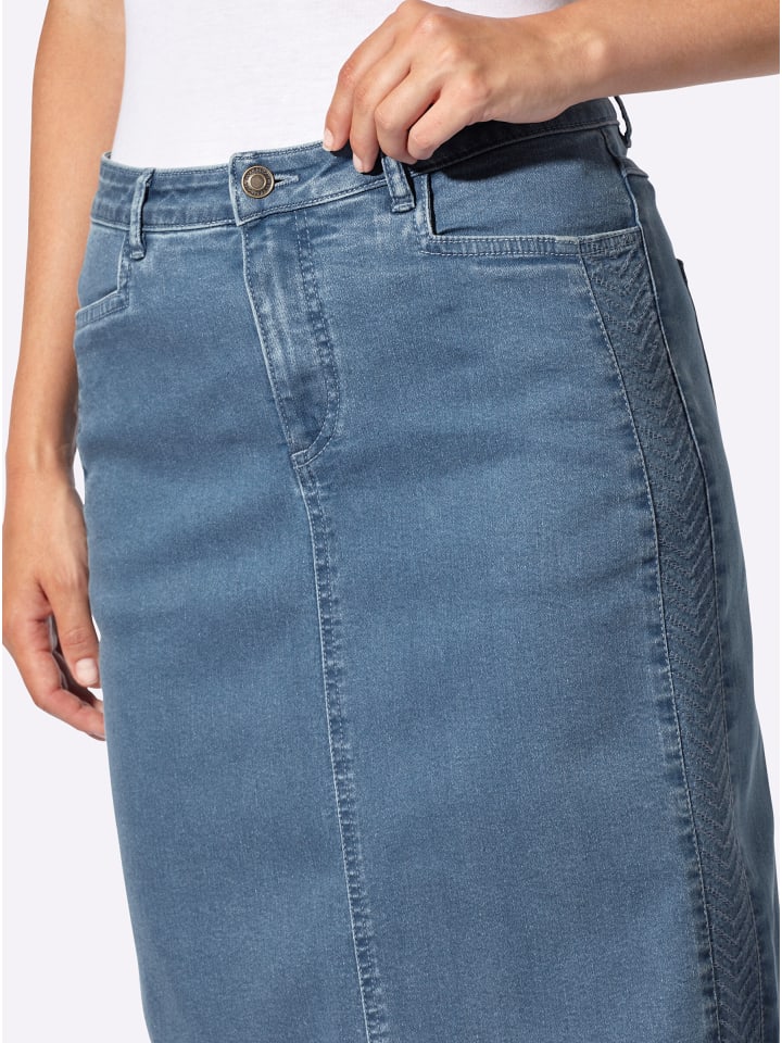 Благодаря эластичности эта джинсовая юбка идеально сидит по фигуре и невероятно удобна в носке! Модель имеет фигурный пояс, застежку на пуговицы и молнию, а также шлевки для ремня. Вышитые вставки по бокам создают эффект стройнения. Модель соответствует инициативе «Хлопок, сделанный в Африке».