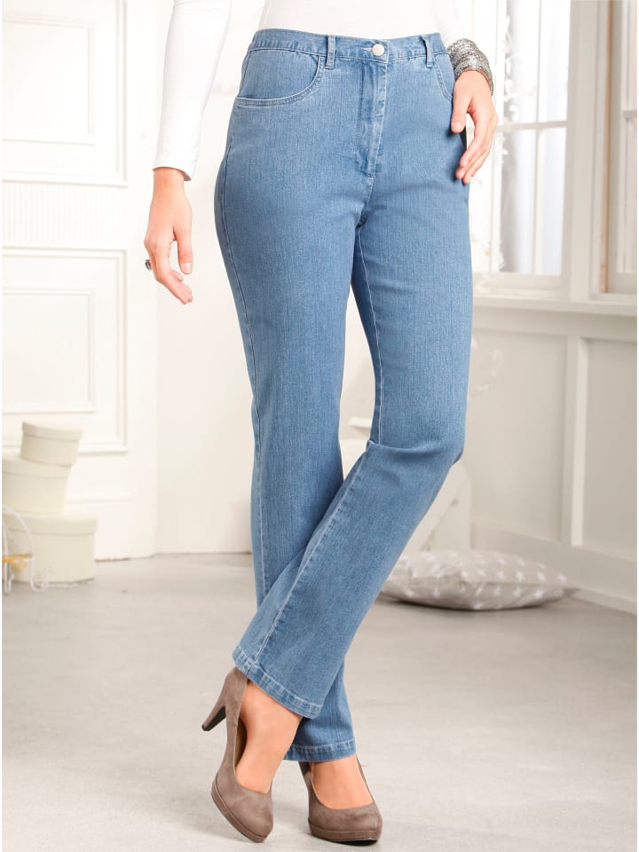 Джинсы с эластичным поясом по бокам, шлевками для ремня и застежкой на пуговицу и молнию. Два передних кармана. Небольшие разрезы для стопы. Длина брючины примерно 36 см. Ремень в комплект не входит.