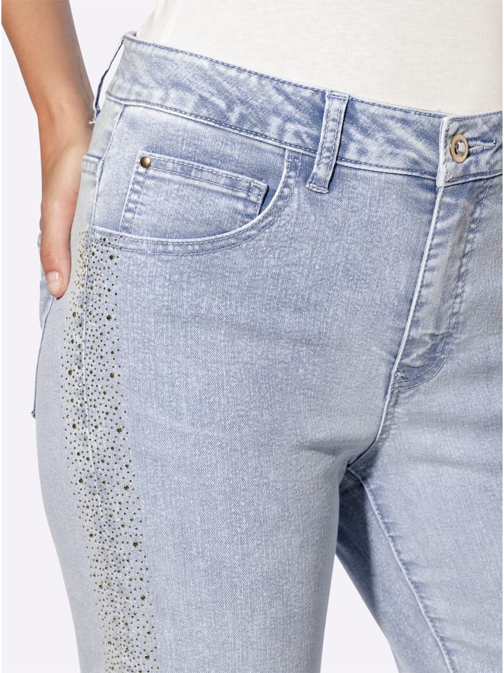 Джинсы свободного кроя с пятью карманами. Украшены сверкающими стразами по бокам, карманами и стильно закрепленным отворотом. Посадка стандартная. Посадка по низу штанины: примерно 42 см. Соответствуют инициативе «Хлопок, сделанный в Африке».