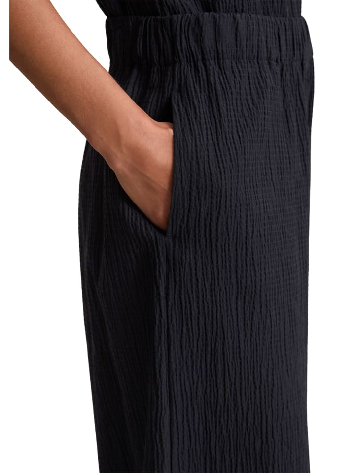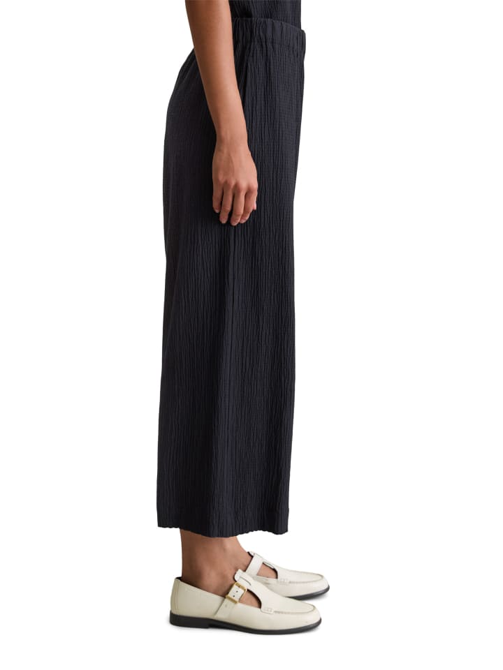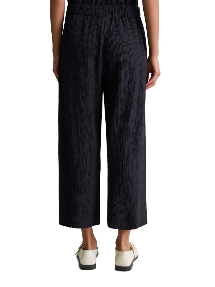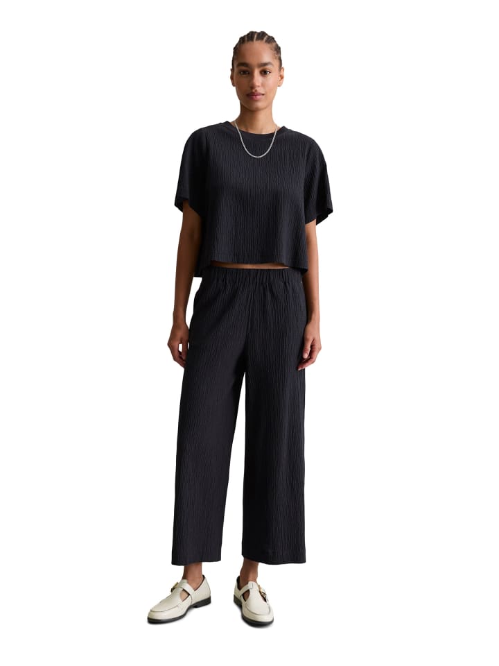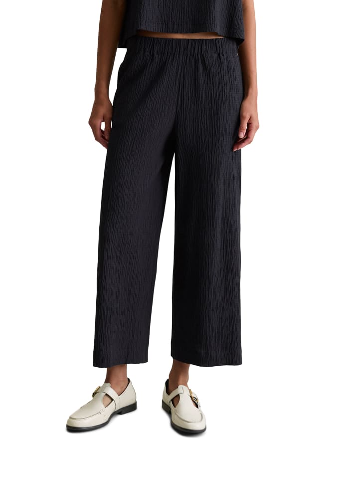 Свободные брюки-клеш от Marc O'Polo DENIM из легкой эластичной ткани с характерной текстурой. Высококачественная смесь органического хлопка и вискозы дышит и дарит коже ощущение комфорта. Эти простые брюки - универсальный и модный вариант. Они отличаются удобным эластичным поясом, свободным кроем, укороченной длиной и боковыми карманами. Идеальное сочетание: сочетайте их с подходящей блузкой, чтобы создать непринужденный образ с головы до ног.