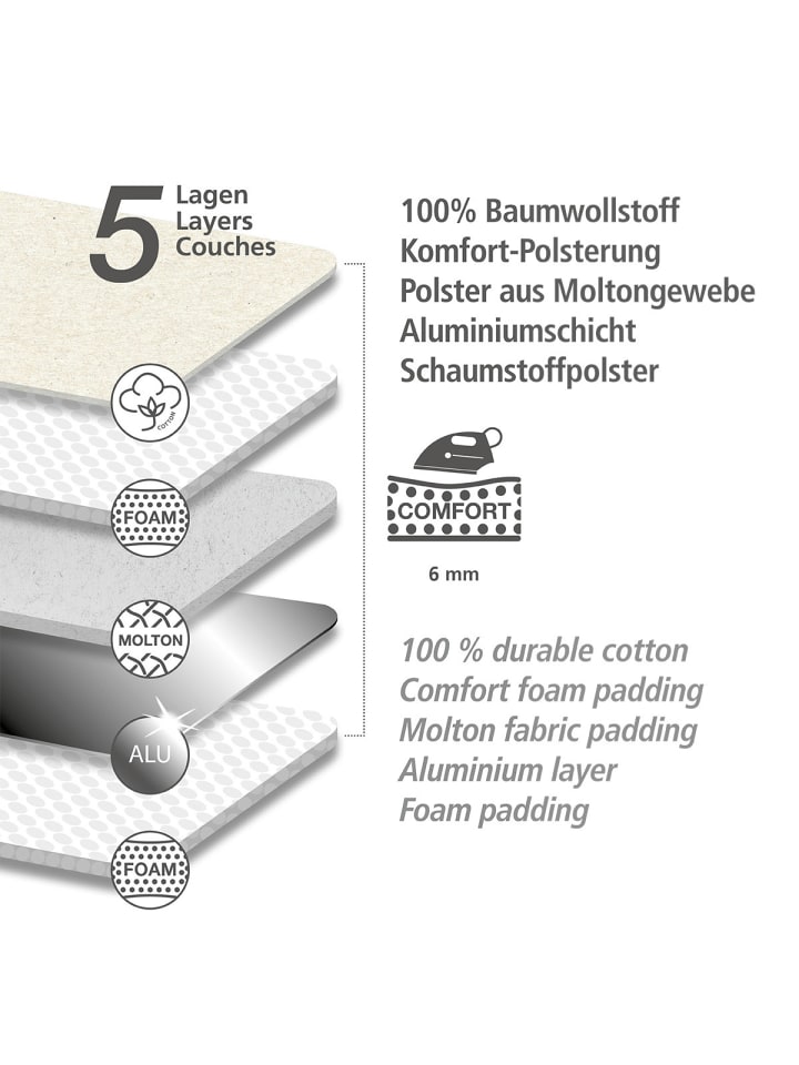 Удобная подкладка толщиной 6 мм состоит из 5 различных слоев, обеспечивающих безупречный результат глажки. Чехол изготовлен из 100% прочного хлопка и оснащен зоной быстрого глажения - своего рода «ковриком для ног» утюга. Во время каждой глажки из-за высоких температур на подошве остаются остатки моющего средства, кондиционера для белья и даже частицы синтетических волокон. Этот слой загрязняет утюг и затрудняет его скольжение. Просто периодически проводите утюгом по зоне очистки на чехле во время глажки: остатки прилипнут, и подошва снова будет плавно скользить по белью. Это экономит около 50% времени глажки по сравнению с обычным гладильным ковриком. Если вы не хотите использовать зону быстрого глажения, вы, конечно же, можете использовать всю поверхность как классический гладильный коврик. Внутренняя часть коврика, изготовленная из ткани Molton, обеспечивает идеальное поглощение тепла и пара, что делает коврик идеально подходящим для использования с паровыми утюгами. Алюминиевый термослой, расположенный непосредственно под тканью Molton, предотвращает образование конденсата на поверхности стола и отражает тепло и пар обратно к изнаночной стороне одежды. Этот желаемый эффект противоглажения означает, что вам в идеале нужно гладить одежду только с одной стороны, экономя время и силы. Гладильный коврик WENKO также станет полезным спутником в путешествиях или на природе, быстро возвращая вашим вещам гладкость и презентабельный вид. Он соответствует стандарту Oeko-Tex 100, устанавливающему, что текстиль не содержит вредных веществ. Кроме того, гладильный коврик произведен в Европе, что сокращает транспортные маршруты и, следовательно, минимизирует выбросы CO2. - Коврик для глажки, 5-слойный, из хлопка - Со встроенной зоной быстрого глажения - Для быстрой глажки без складок - С теплоотражающим алюминиевым слоем - Можно использовать практически на любом столе - Также подходит для паровых утюгов - Не капает благодаря паровому барьеру - Размеры (Ш x Г): 130 x 65 см