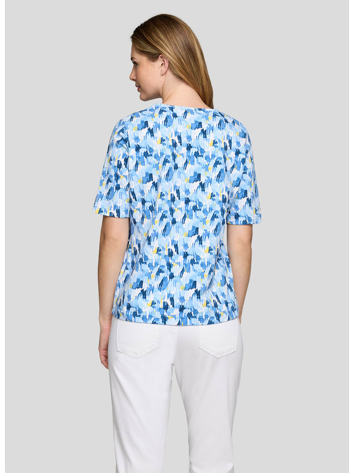 Эта рубашка украшена ярким принтом по всей поверхности в стиле абстрактных мазков кисти. Гармонично подобранные цвета и удобный крой делают ее универсальным повседневным аксессуаром. Абстрактный рисунок по всей поверхности с живописным характером. Круглый вырез обеспечивает классический комфорт. Рукава до середины голени - идеальный вариант для повседневной носки и переходных сезонов. Мягкий трикотаж с приятной эластичностью. Слегка приталенный крой для женственной посадки.