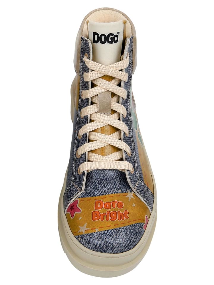 Высокие кроссовки DOGO Adriana «Dare Bright» - это яркое заявление для тех, кто любит выделяться. Благодаря креативному дизайну в стиле денима, изображению золотой рыбки и эффектной надписи «Dare Bright», эти кроссовки сочетают в себе стильные акценты и нотку индивидуальности.