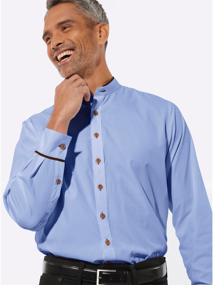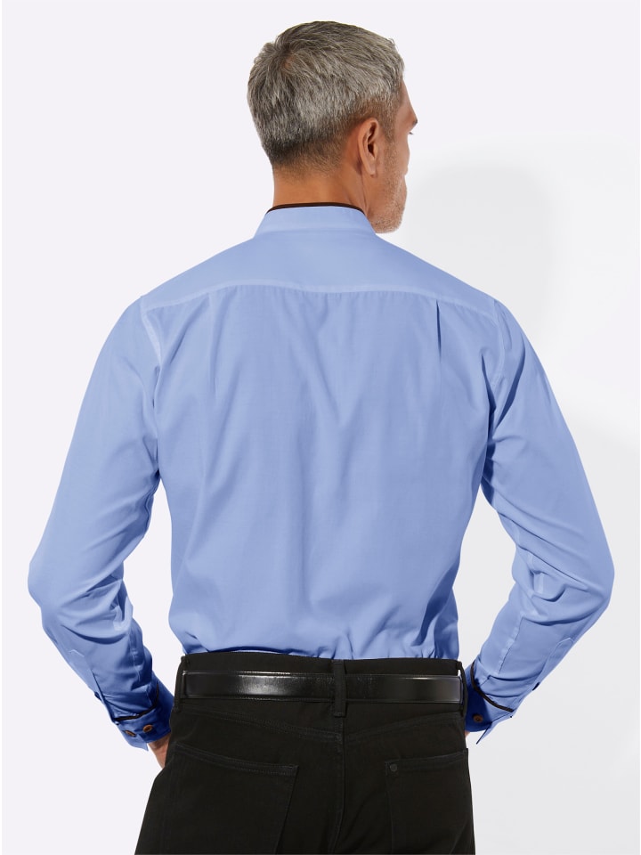 Стильная вещь на все случаи жизни: рубашка с узкой контрастной окантовкой на небольшом воротнике-стойке и на манжетах с разрезами. Пуговицы под дерево. Кокетка и складки сзади.