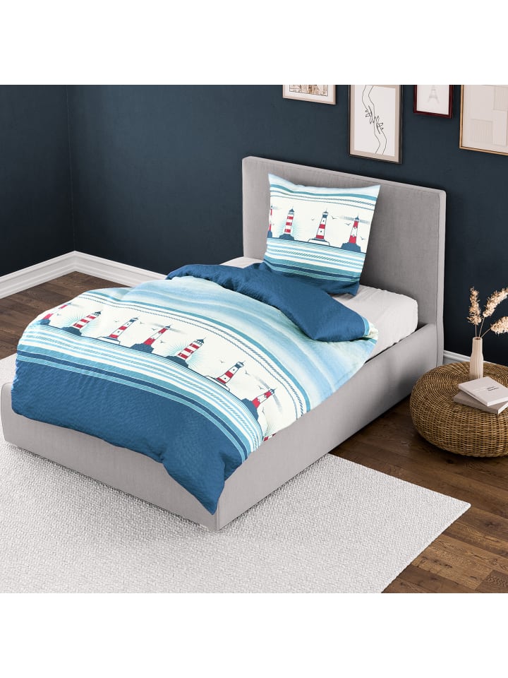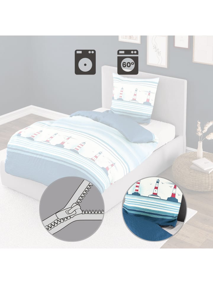 Постельное белье Bierbaum Seersucker. Любите побережье? Благодаря маякам и полоскам это постельное белье привнесет морское очарование в вашу спальню. Легкая, воздушная и нежная ткань превратит ваши сны в реальность. Прочный жатый эффект обеспечивает оптимальную циркуляцию воздуха; оно терморегулирует, дышащее и приятное для кожи. Вы быстро оцените простоту ухода за этим качеством, так как оно не мнется и легко надевается благодаря молнии.