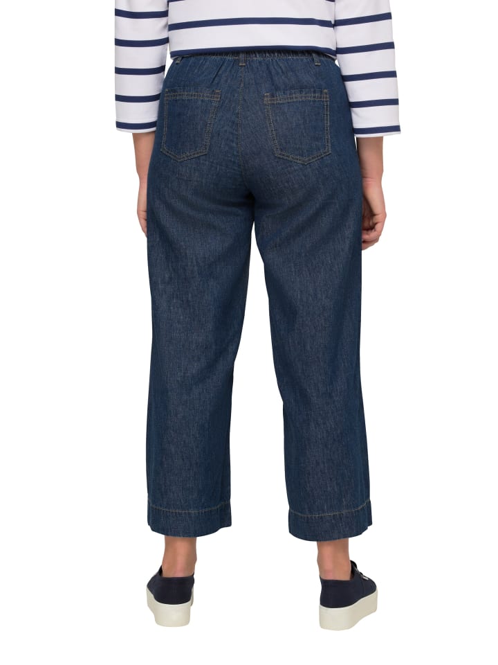 Брюки-кюлоты из смесовой льняной ткани, длиной примерно до икры, с широкими штанинами. Эластичный пояс со шлевками для ремня, 4 кармана.