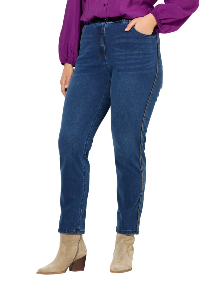 Джинсы Mia, эластичные, удобной посадки, из мягкого денима с декоративной строчкой. 5 карманов, комфортный пояс со шлевками для ремня, застежка на пуговицу и молнию.