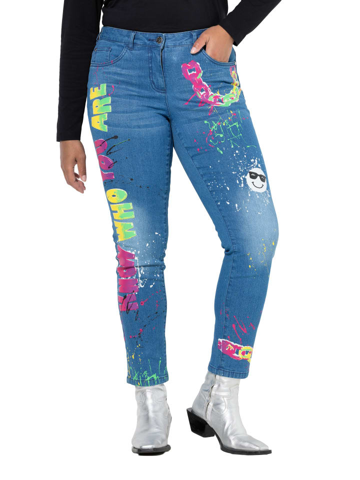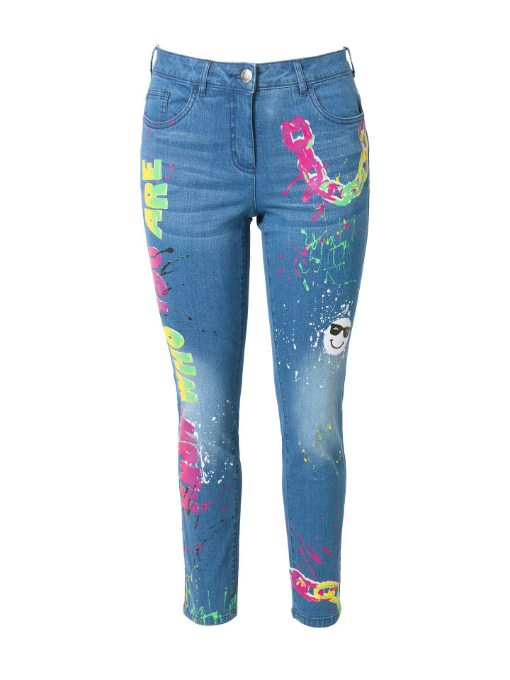 Узкие джинсы, облегающего кроя, с эластичной тканью, обеспечивающей комфорт. Модный эффект потертости, неоновые принты спереди. Модель с пятью карманами, пояс со шлевками для ремня, застежка на пуговицу и молнию.