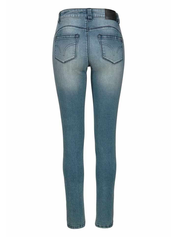 С утягивающим эффектом. Модель с пятью карманами, декоративными заклепками и особой отделкой швов. Застежка на молнию. Удобный эластичный деним.