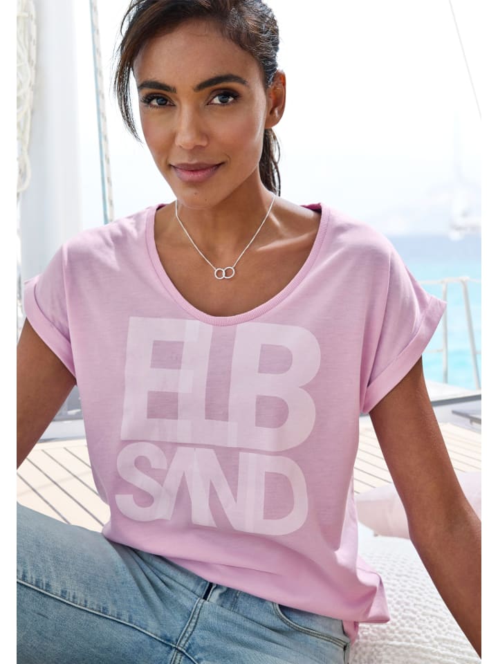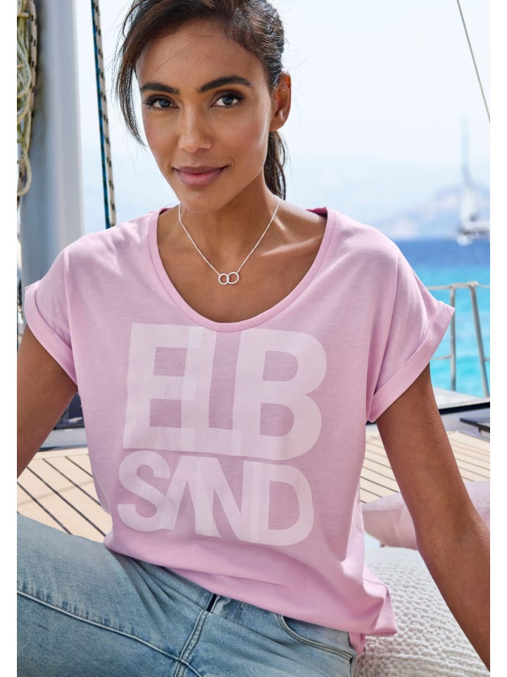 Повседневная рубашка от Elbsand. Крупный фирменный принт спереди. Круглый вырез с манжетами. Короткие рукава с подворотами, бесшовные. Прямой подол. Приталенный силуэт. Мягкий трикотаж.