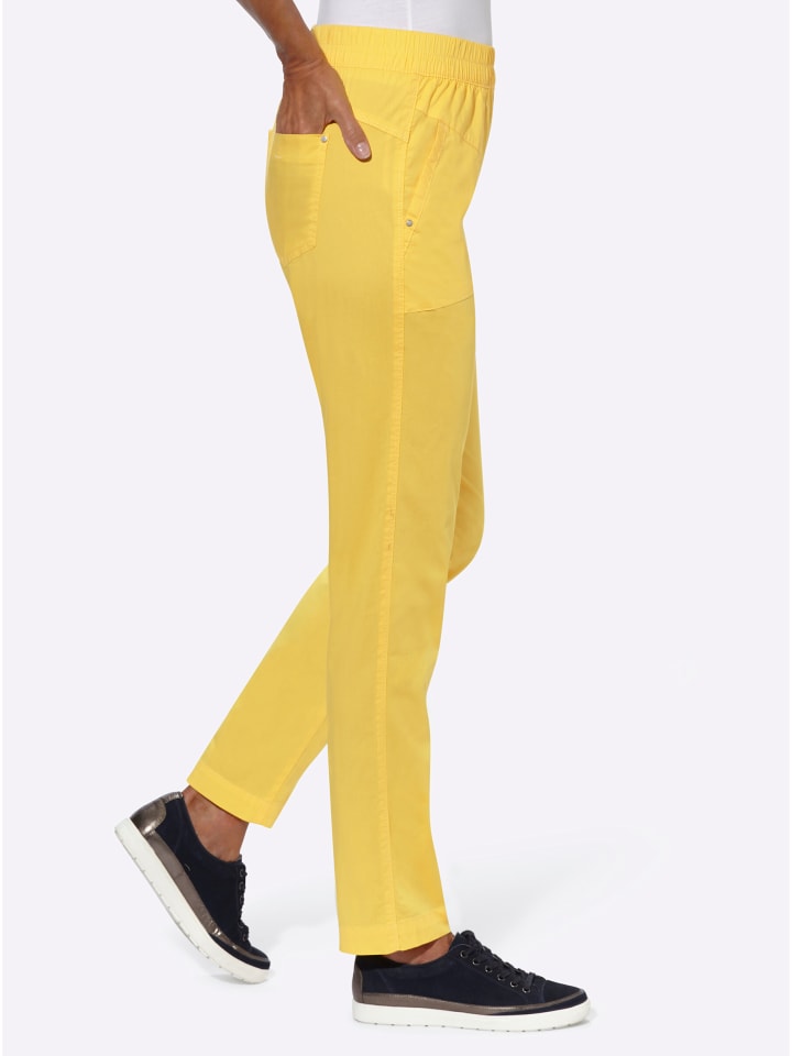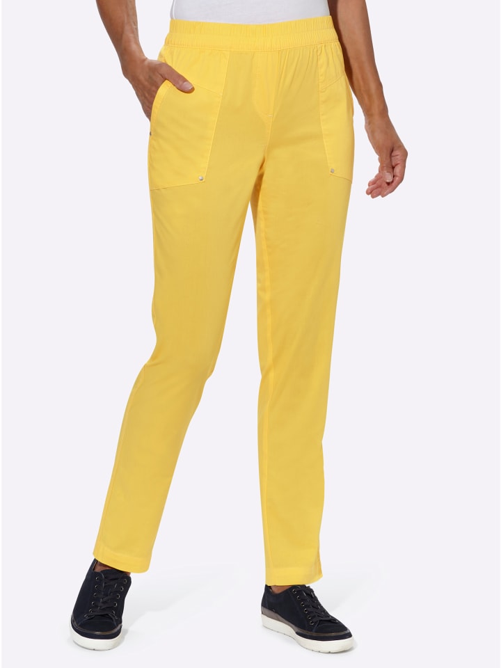 Прекрасно, повседневно и удобно! Брюки с широким поясом на резинке по всему периметру и имитацией молнии. Регулируемая кокетка сзади. Накладные карманы спереди и сзади украшены заклепками. Изготовлены из дышащей смесовой ткани. Соответствуют инициативе «Сделано в Африке» (Cotton Made in Africa). Длина брючины примерно 36 см. Ремень в комплект не входит.