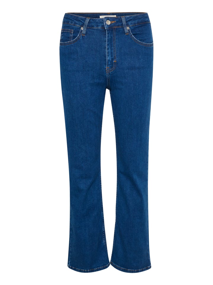 Прямые джинсы со средней посадкой и классическим кроем с пятью карманами. Слегка расклешенный низ штанины и текстурированный вид денима.
