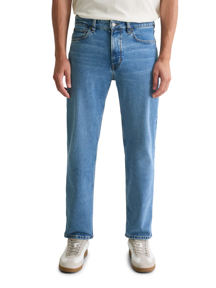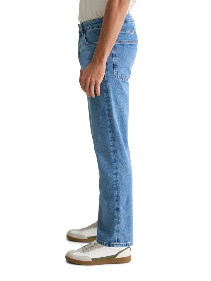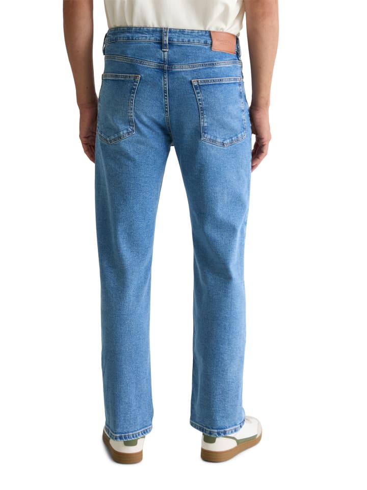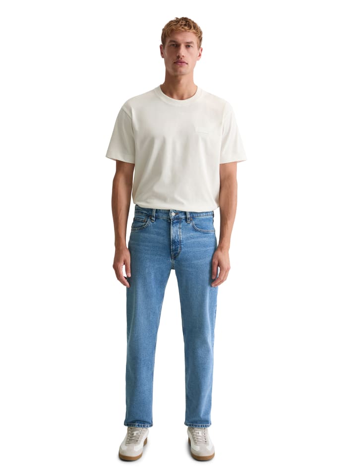 Эффектные и универсальные: джинсы Kalmo из настоящего синего эластичного денима сочетают в себе органический хлопок, переработанный полиэстер и эластан. Они стираются в готовом виде для мягкости и легкого эффекта потертости, имеют классический пятикарманный крой и прямой крой. Металлическая пуговица с логотипом, молния и заклепки по краям карманов добавляют отличительные акценты, а лейбл из натуральной кожи на поясе завершает дизайн. Наша цель - производить самые экологичные джинсы, от сырья до процессов окрашивания и стирки. Следите за нашим стремлением к более ответственному производству. Это наша ответственность.