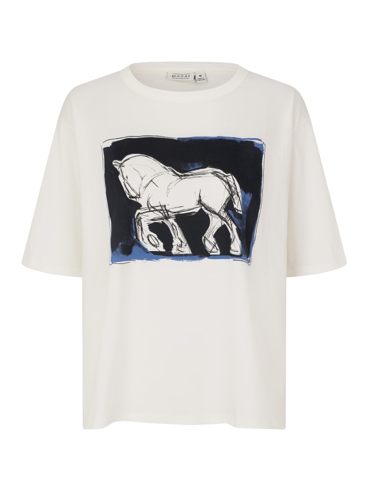 Расписанный вручную рисунок лошади привлекает внимание и придает этому мягкому топу неповторимую индивидуальность. Классический прямой крой обеспечивает удобную посадку, а круглый вырез, короткие рукава и едва заметные разрезы по бокам обеспечивают свободу движений и легкость. Сочетайте с узкими брюками для создания минималистичного образа, с джинсами для повседневного или со струящейся юбкой для создания женственного контраста. Большемерит, заказывайте на размер меньше.