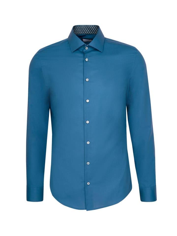 Эта мужская рубашка сочетает в себе четкие линии кроя и элегантную утонченность. Приталенный крой подчеркивает фигуру, не стесняя движений. Классический воротник Kent и планка на пуговицах придают ей вневременную элегантность. Легкая поплиновая ткань впечатляет своей гладкой текстурой и исключительным комфортом. Регулируемые манжеты на двух пуговицах обеспечивают гибкость для повседневной носки. Закругленный подол делает рубашку достаточно универсальной для сочетания с различными нарядами. Узорчатая нашивка на воротнике добавляет изысканности. Изящный вышитый логотип над манжетой стильно дополняет образ. Эта рубашка одинаково подходит для офиса, мероприятий и отдыха. Высококачественная вещь для взыскательных мужчин.