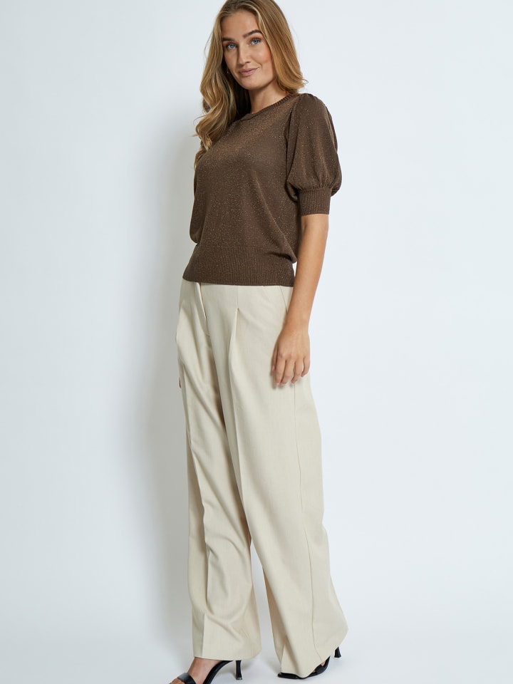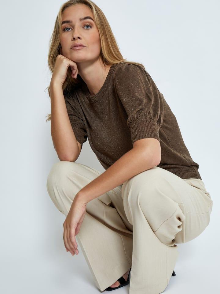 Свитер Liva изготовлен из смеси Eco Vero, экологичной альтернативы вискозе, и металлизированных волокон, что придает ему легкость и блеск. У свитера круглый вырез, рукава-буфы и ребристые края.