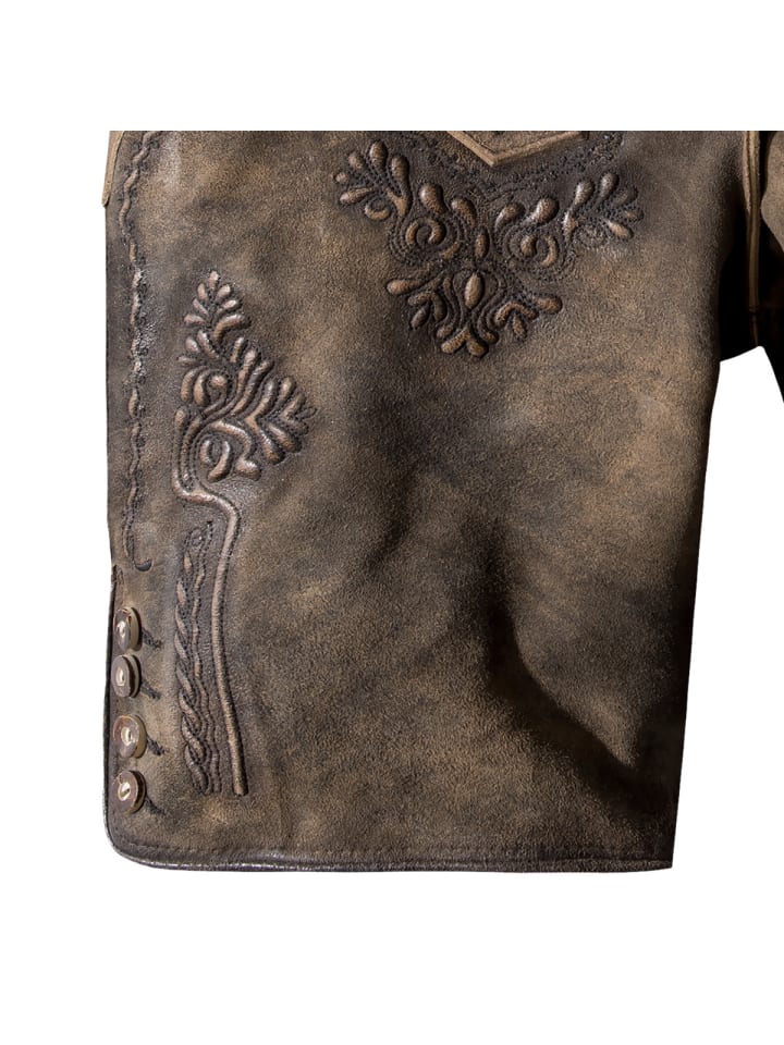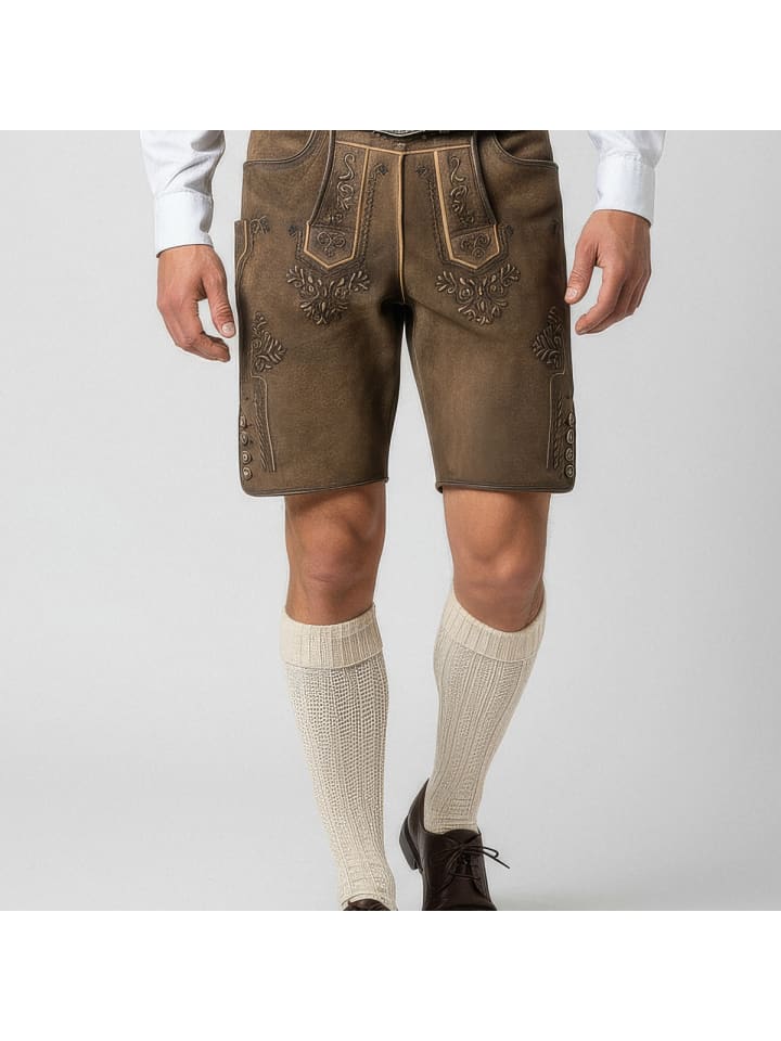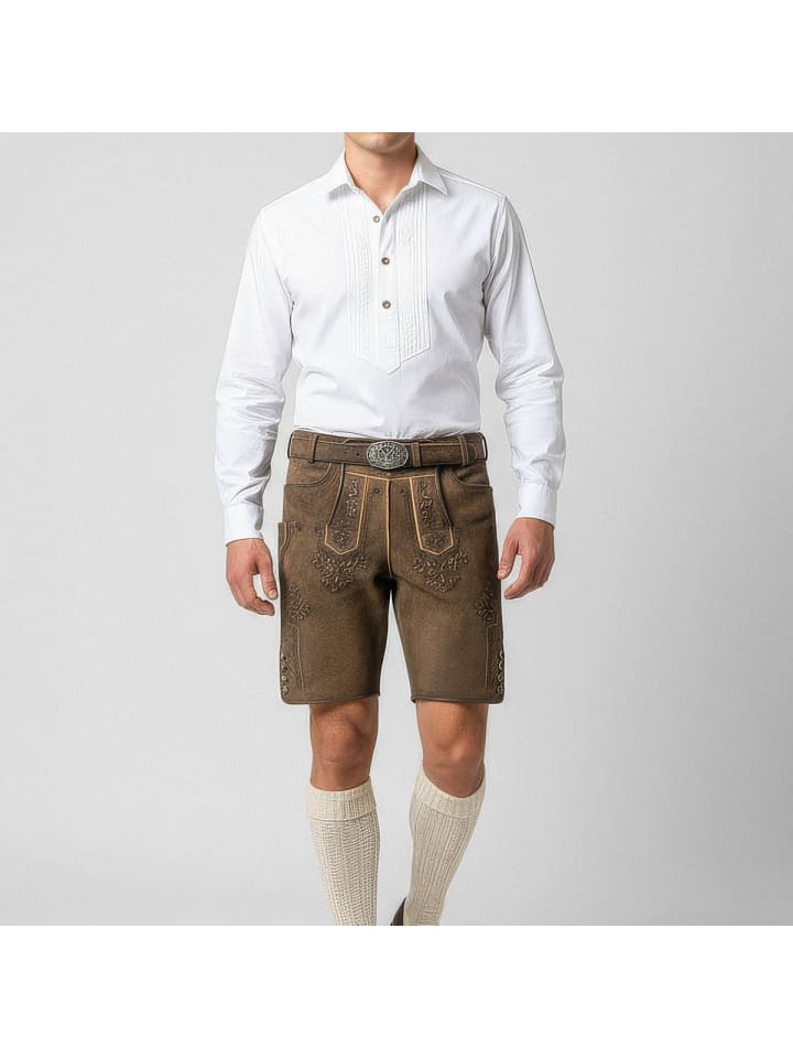 Мужские кожаные брюки Artur ручной работы от Stockerpoint - настоящий маст-хэв на Октоберфесте. Мягкий, эластичный кожаный верх с детальной вышивкой на бедрах, боках и нагруднике делает их настоящей приманкой для глаз. Еще одна изюминка - пряжка на ремне с изображением оленя. Ластовица сзади позволяет легко отрегулировать брюки по обхвату талии. Стильные пуговицы на нагруднике и штанине идеально дополняют эти элегантные кожаные брюки. Также есть задний карман для кошелька и небольшой карман на правой штанине для хранения мелких предметов, таких как мелочь. Эти кожаные брюки сочетают в себе традиционное мастерство с практичными деталями и станут настоящей приманкой для глаз на Октоберфесте.