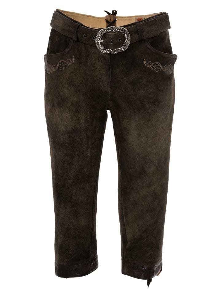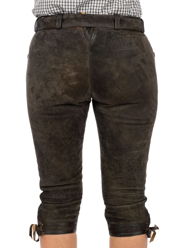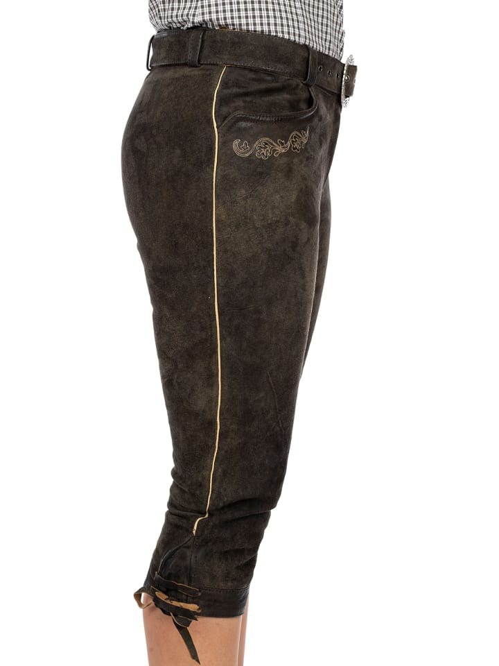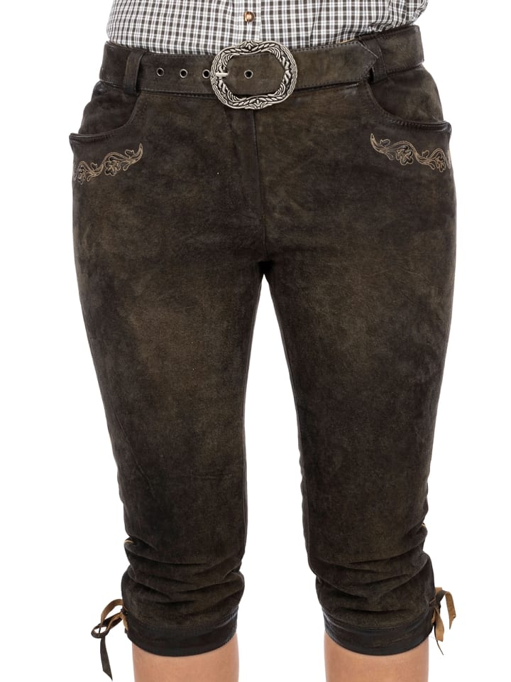 Элегантные женские брюки в традиционном стиле. Эти брюки из козьей кожи прекрасно подчеркивают вашу фигуру: модель HEDY имеет облегающий крой и украшена традиционными деталями, такими как вышивка на двух боковых карманах. Длина до колена завязывается боковыми ремешками, что придает брюкам легкую игривость. Широкий пояс, несомненно, притягивает взгляд. Он застегивается на искусно изготовленную серебряную пряжку. Белая блузка идеально дополнит эти брюки из состаренного дуба.