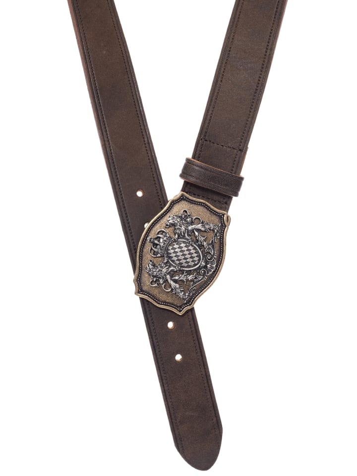 Прочный традиционный ремень с львиными головами. Традиционный ремень K438 создан, чтобы привлекать внимание, и ему это определенно удается. Два серебряных льва в профиль поддерживают корону и ромбовидный узор. Королевственнее не бывает. Декоративная строчка на этом коричневом ремне из цельнозерновой коровьей кожи добавляет ему еще больше привлекательности. Этот высококачественный ремень доставит вам массу удовольствия, если носить его с ледерхозенами.