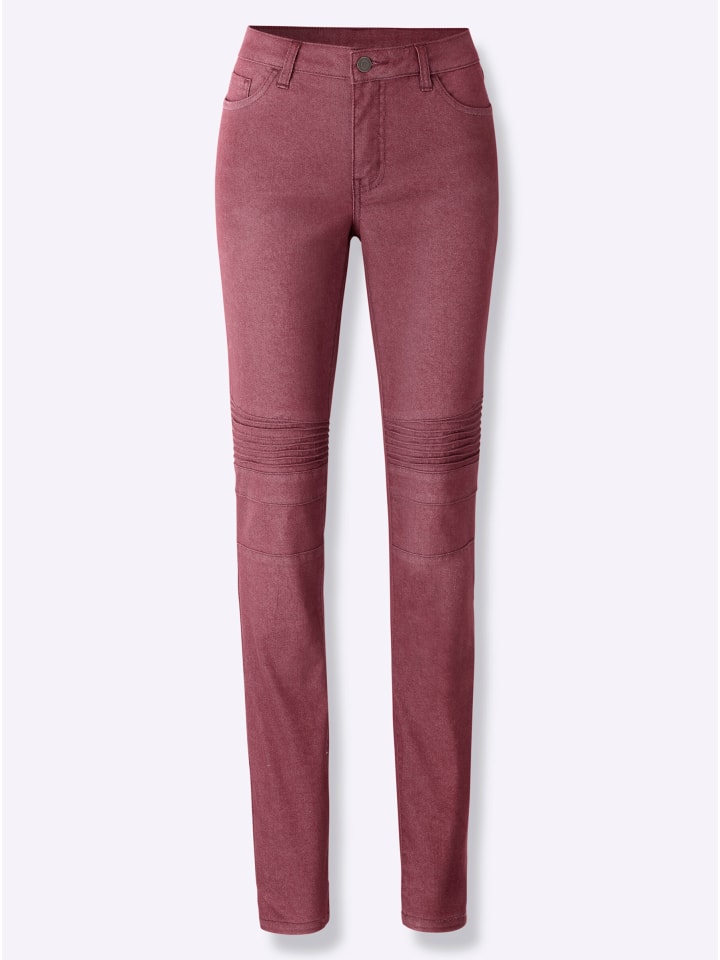 Для множества модных образов: джинсы нежного оттенка и модного байкерского стиля благодаря косым складкам и разделительным швам спереди. Формованный пояс со шлевками для ремня и застежкой на пуговицу и молнию спереди. Приталенная кокетка сзади. Модель с 5 карманами. Из приятной легкой и очень мягкой эластичной ткани. Длина брючины примерно 32 см. Ремень в комплект не входит.