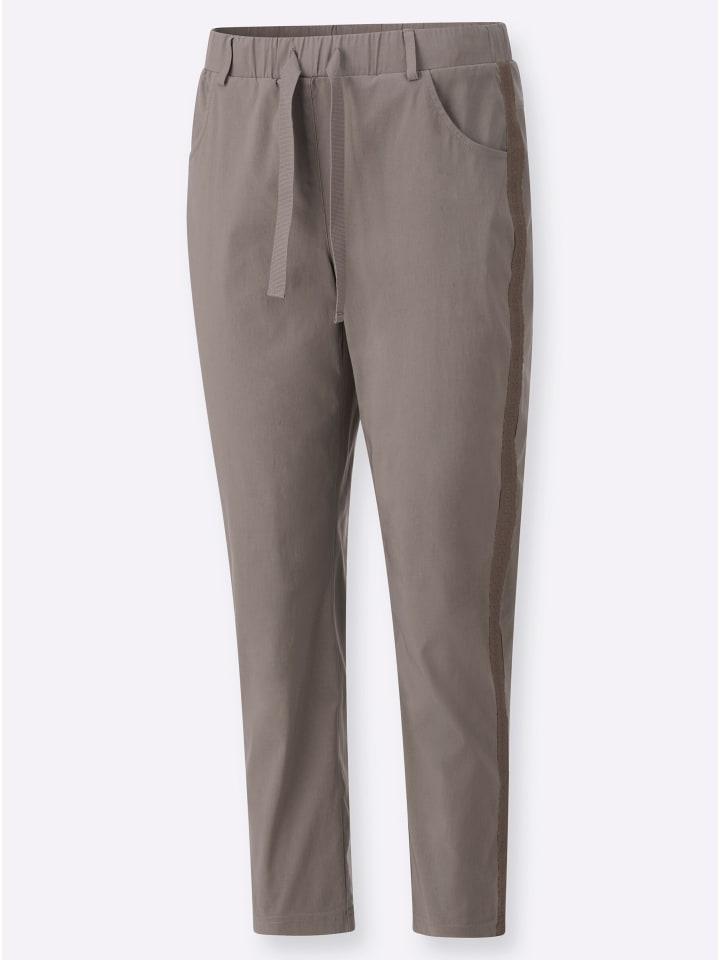 Изюминкой этих приятных на ощупь мягких брюк 7/8 является пришитая тесьма из блестящей пряжи вдоль бокового шва. Они удобно застегиваются на резинку с поясом на резинке, шлевками для ремня, кулиской и завязывающимся поясом. Два передних кармана. Сзади - приталенная кокетка и два накладных кармана. Длина брючины около 30 см. Ремень в комплект не входит.