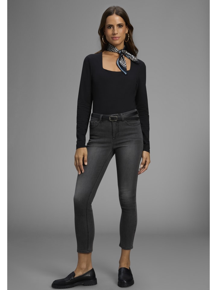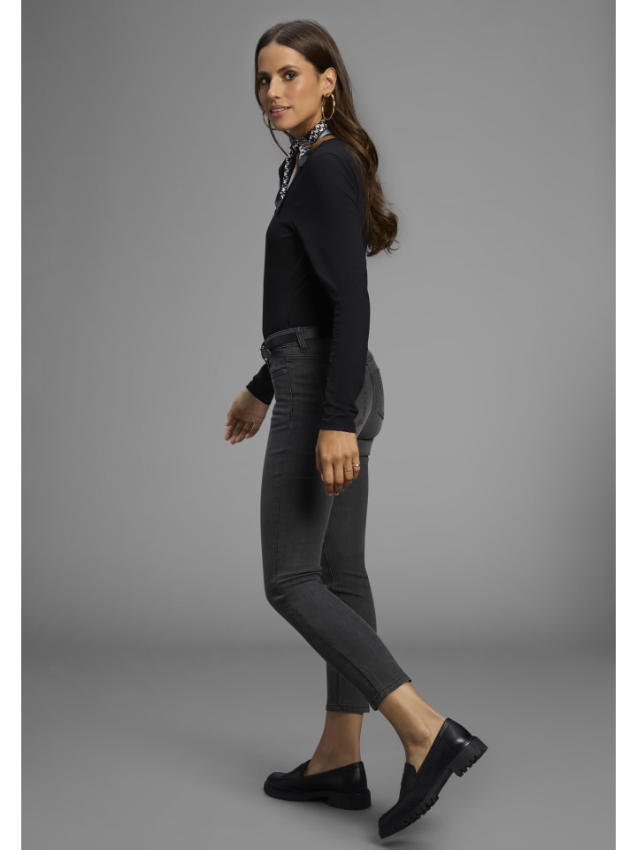 Пятикарманный фасон с заклепками на кармане для монет. Высокий пояс создает эффект потертости на животе. Слегка потертые края на бедрах и ягодицах. Прочный эластичный деним.