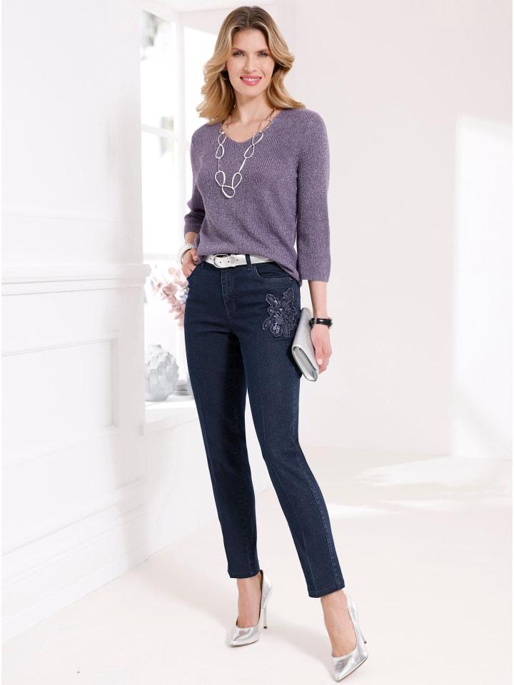 Удивительно мягкие джинсы с эффектной деталью: роскошная вышивка и сверкающие пайетки придают модный штрих одной штанине! Классический пояс со шлевками, застежкой на пуговицу и молнию. Четыре кармана. Сзади приталенная кокетка для идеальной посадки на любой размер. Ширина брючины примерно 34 см. Ремень в комплект не входит.