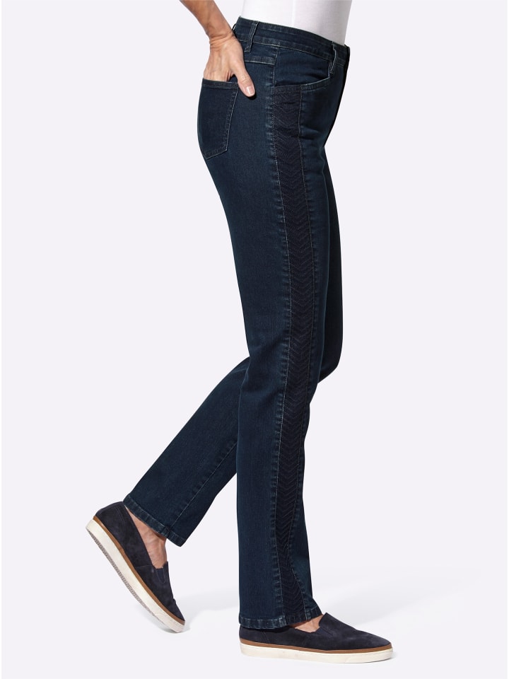 Эти джинсы могут многое предложить! Интересная деталь: боковой шов украшен эффектной вышивкой, которая визуально удлиняет ноги. Они имеют классический дизайн с четырьмя карманами, застежкой на пуговицу, молнию и шлевками для ремня. Эластичная ткань с переработанным полиэстером невероятно комфортна и не сковывает движений. Длина брючины около 40 см. Ремень в комплект не входит. Джинсы поддерживают инициативу «Сделано в Африке» (Cat. Made in Africa).