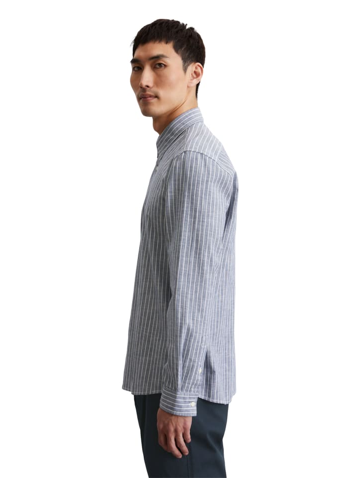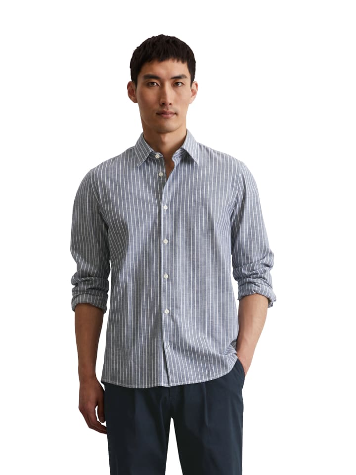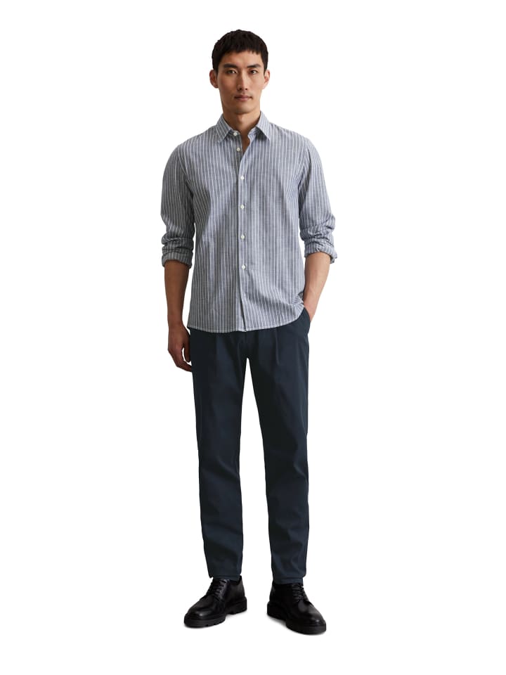 Эта рубашка в вертикальную полоску, окрашенная в пряже из чистого сертифицированного органического хлопка, станет стильным дополнением на каждый день. Идеально подходит для офиса с деловыми брюками или для вечернего выхода с джинсами. Мужской крой, классический воротник Kent, планка по всей длине и длинные рукава с манжетами на двух пуговицах обеспечивают уверенный вид. Современный вид ткани с пряжей разной плотности добавляет текстуру и глубину. Промышленная предварительная стирка делает ткань исключительно мягкой на ощупь и подчеркивает непринужденный, повседневный образ. Слегка закругленный подол завершает дизайн.