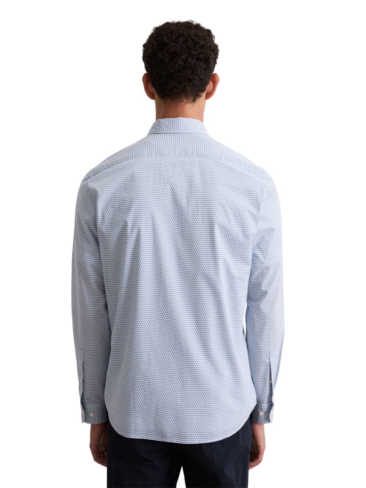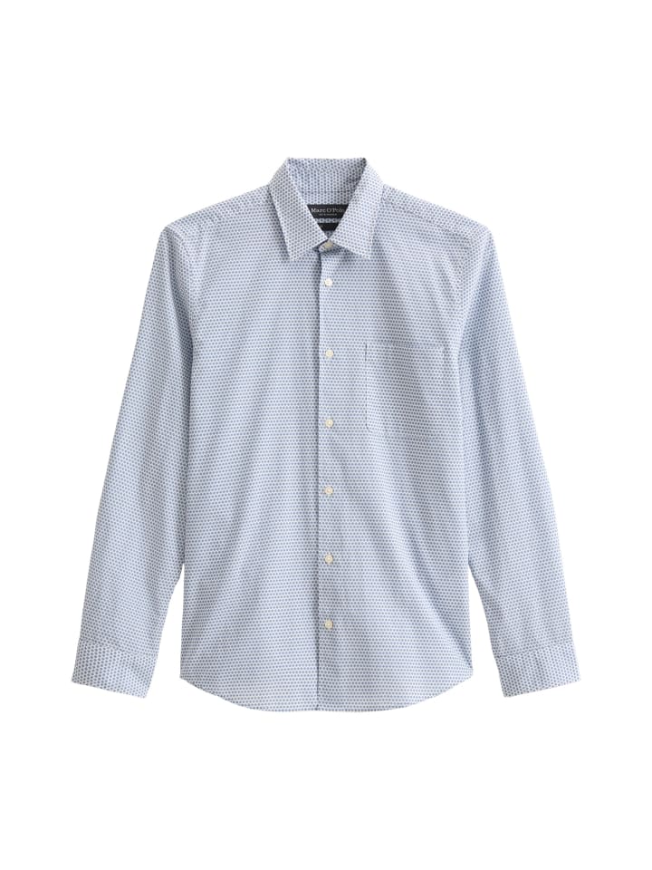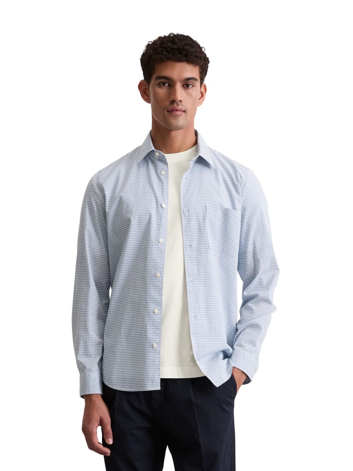 Рубашка из чистого сертифицированного органического хлопка с мелким принтом по всей поверхности и слегка фактурной тканью. Воротник «Кент», длинные рукава с манжетами на двух пуговицах и закругленный низ создают элегантный образ. Приталенный крой и нагрудный карман дополняют дизайн. Универсальная и легко комбинируемая модель - подходит для офиса, особых случаев или как стильное дополнение к повседневной одежде.