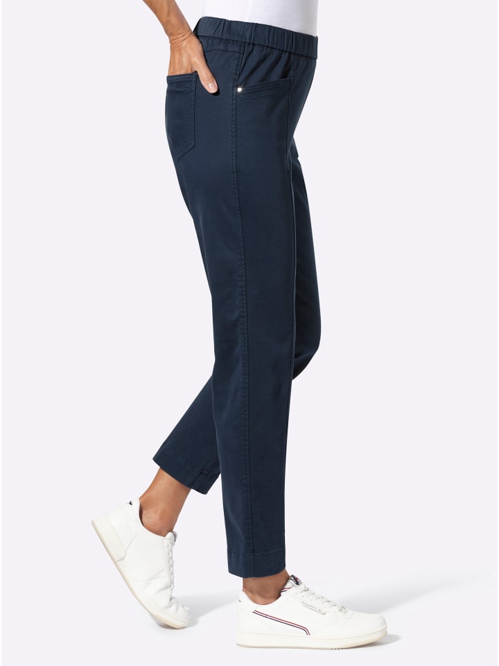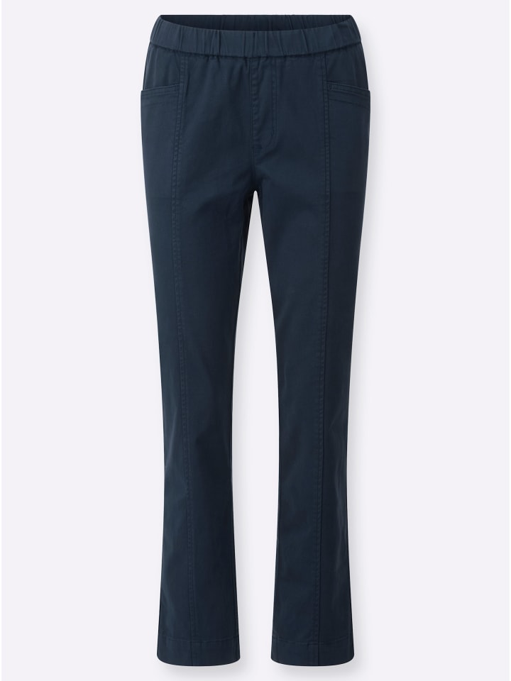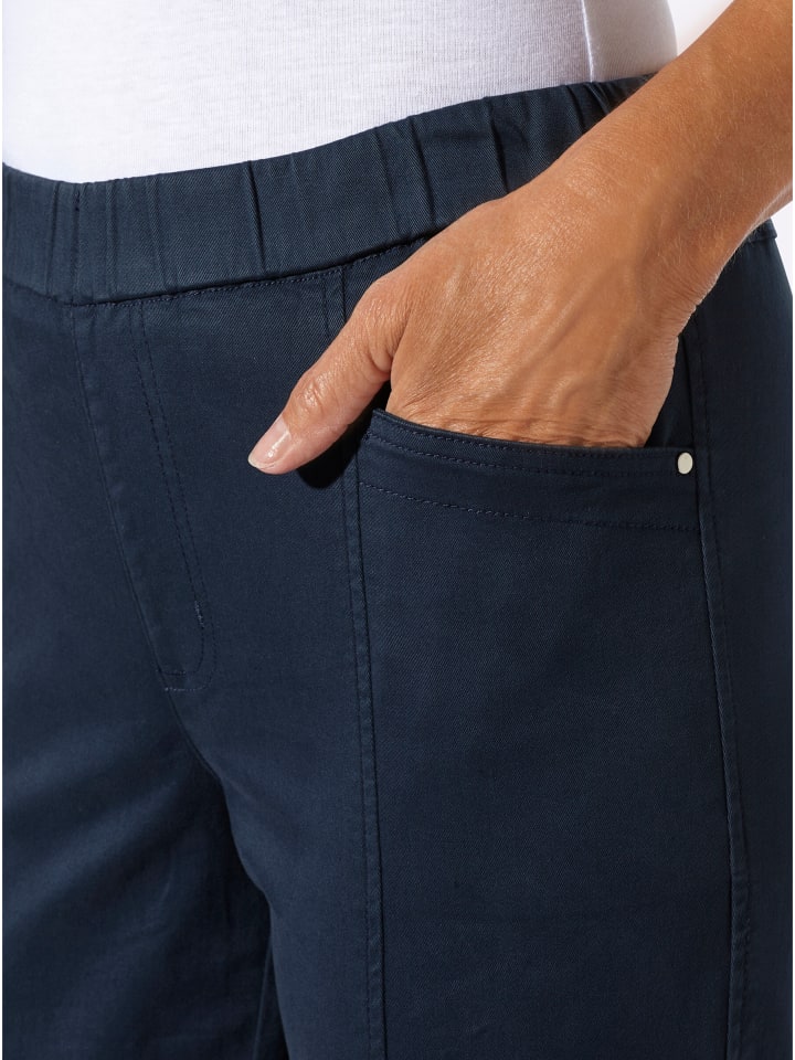 Эти джинсы из твила обеспечивают исключительный комфорт в течение всего дня благодаря эластичной ткани и удобному эластичному поясу. Особенности: имитация ширинки-молнии, два передних кармана, приталенная кокеточка и два задних кармана. Швы вдоль штанин создают эффект удлинения. Длина брючины примерно 38 см. Соответствует инициативе «Хлопок, сделанный в Африке».