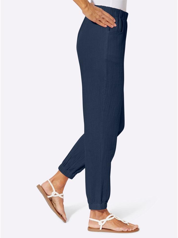 Чистая легкость! Удобные брюки из воздушного муслина. С резинкой на поясе, двумя боковыми карманами и резинкой по низу брючины. Длина брючины примерно 28 см.