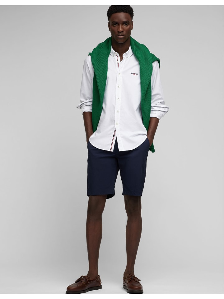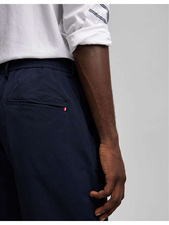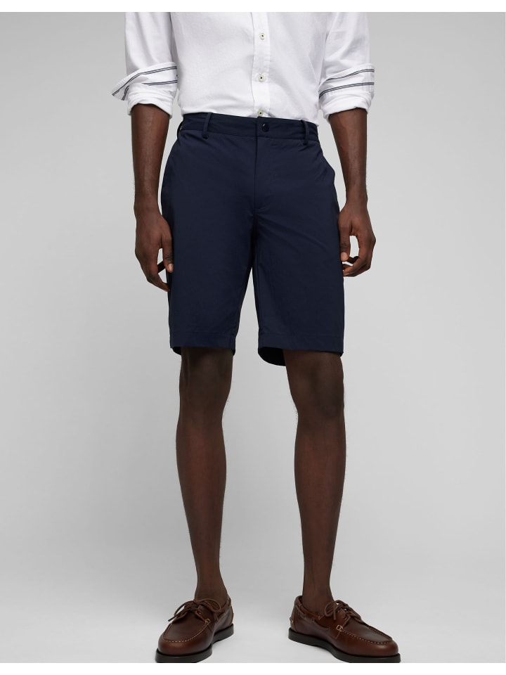 Наши удобные бермуды H-Xtension technical из нейлона с эластаном обеспечивают максимальный комфорт. Современный крой и высокоэластичный пояс обеспечивают дополнительную гибкость. Застежка спереди оснащена кнопкой с логотипом и потайной молнией для элегантного вида. Французские карманы обеспечивают удобное хранение, а задние карманы с окантовкой и застежкой на пуговицы добавляют нотку изысканности. Культовая полоса на заднем кармане и вышивка над задним карманом дополняют образ. Длина брючины в размере 34 составляет 53 см, что обеспечивает удобную и стильную посадку.