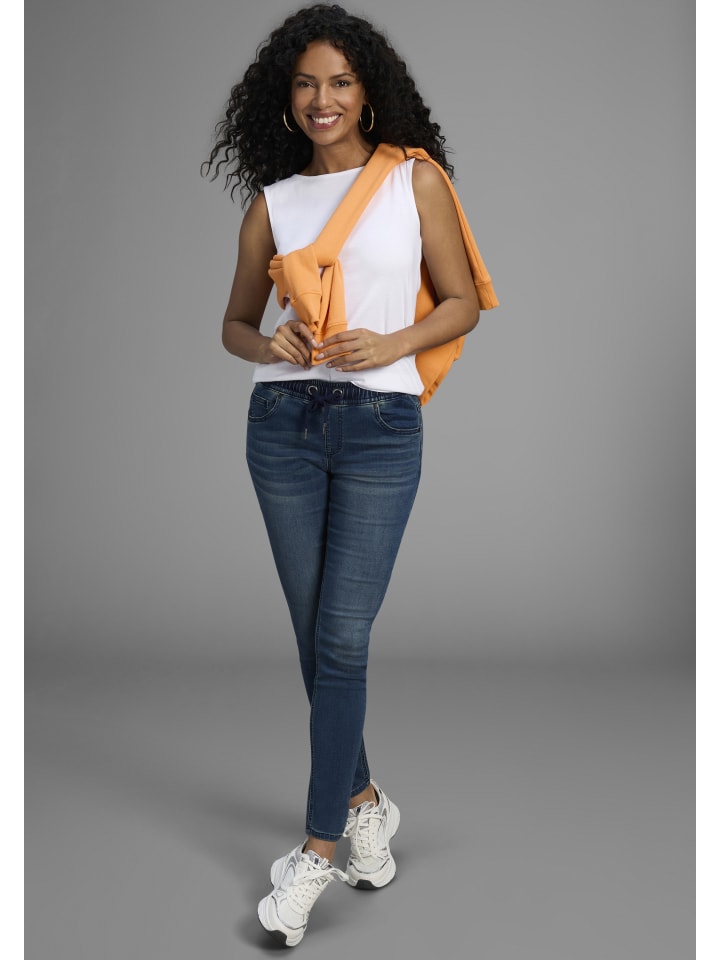 - Эластичные джинсы из эластичного трикотажного материала, обеспечивающего свободу движений.