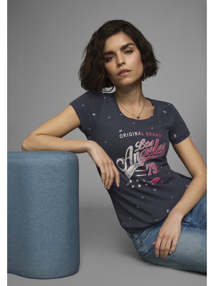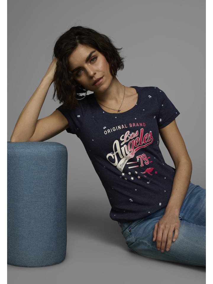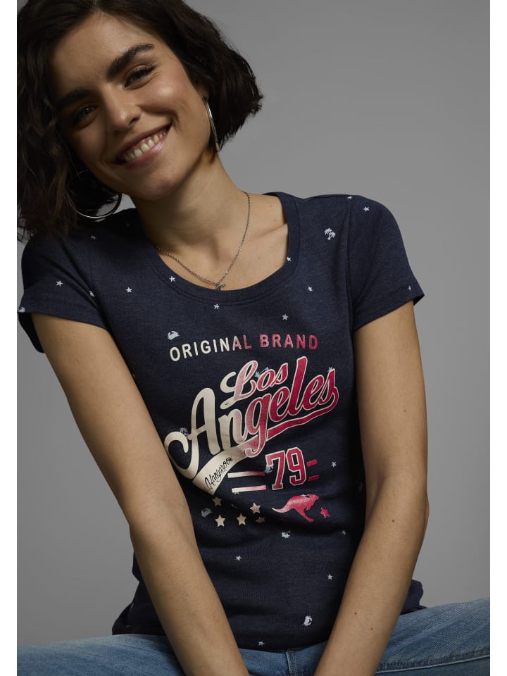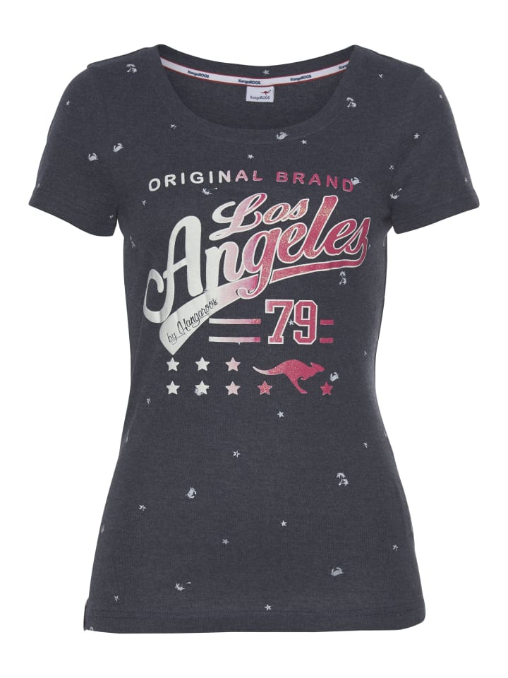 Универсальная женская футболка от KangaROOS. Приталенный крой до бедер и стильный принт. Эластичная трикотажная ткань в рубчик позволяет верху свободно двигаться.
