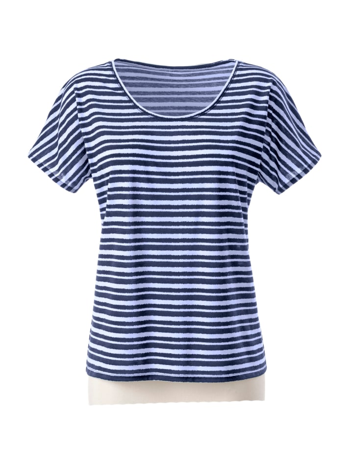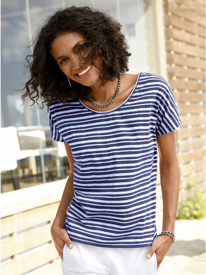 Эта спортивная рубашка с круглым вырезом имеет красивый свободный крой и впечатляет своим стильным полосатым рисунком.