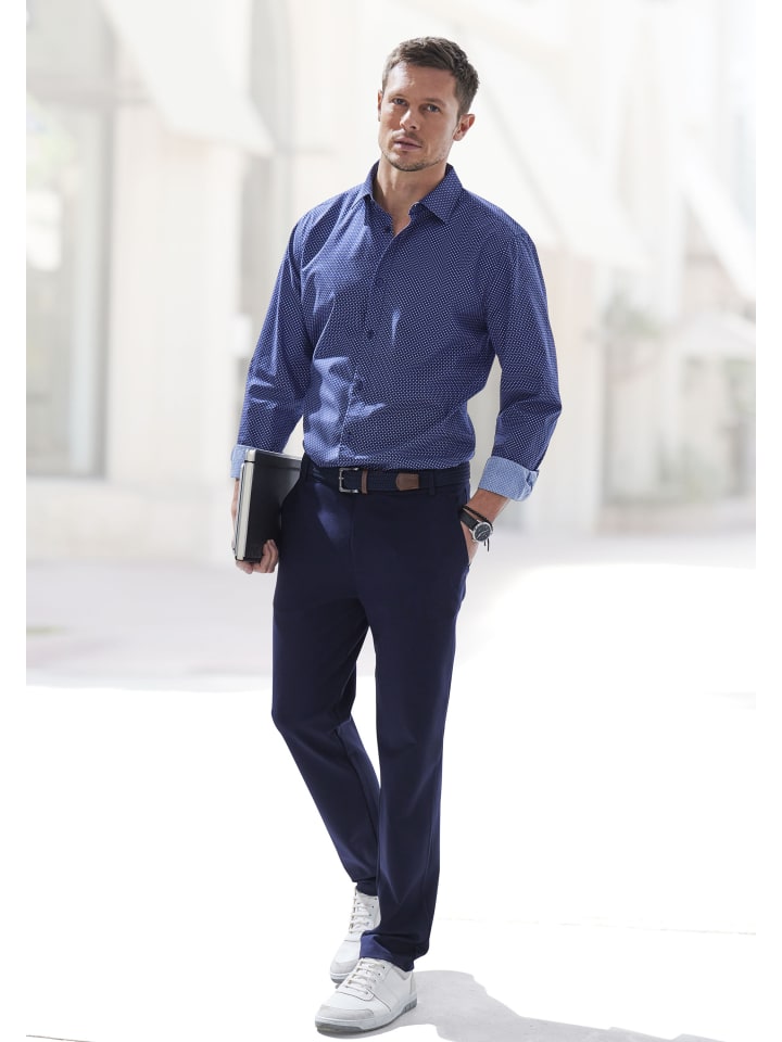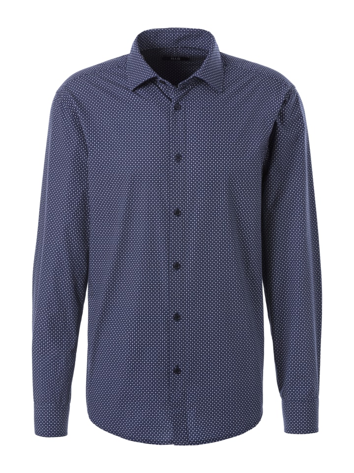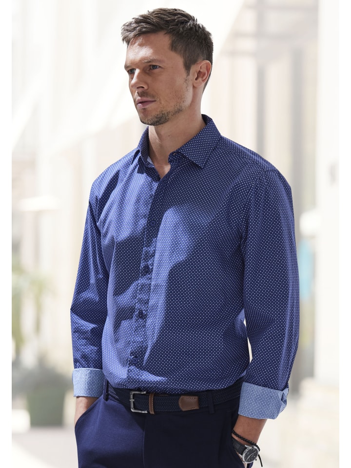 Мужская рубашка с длинными рукавами от HIS. Отличается модным воротником «акулий хвост» и нежным узором по всей поверхности. Изготовлена из приятного хлопка.
