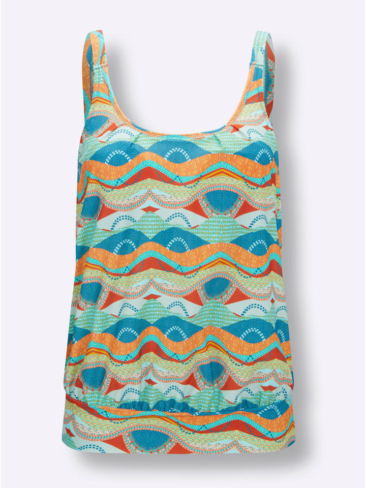 Ищете топ, который подчеркнет вашу фигуру? Больше не ищите! Этот свободный танкини с приталенным поясом и привлекательным этническим принтом. Регулируемые бретели. Мягкие чашки с поясом под грудью. Прямая спинка.