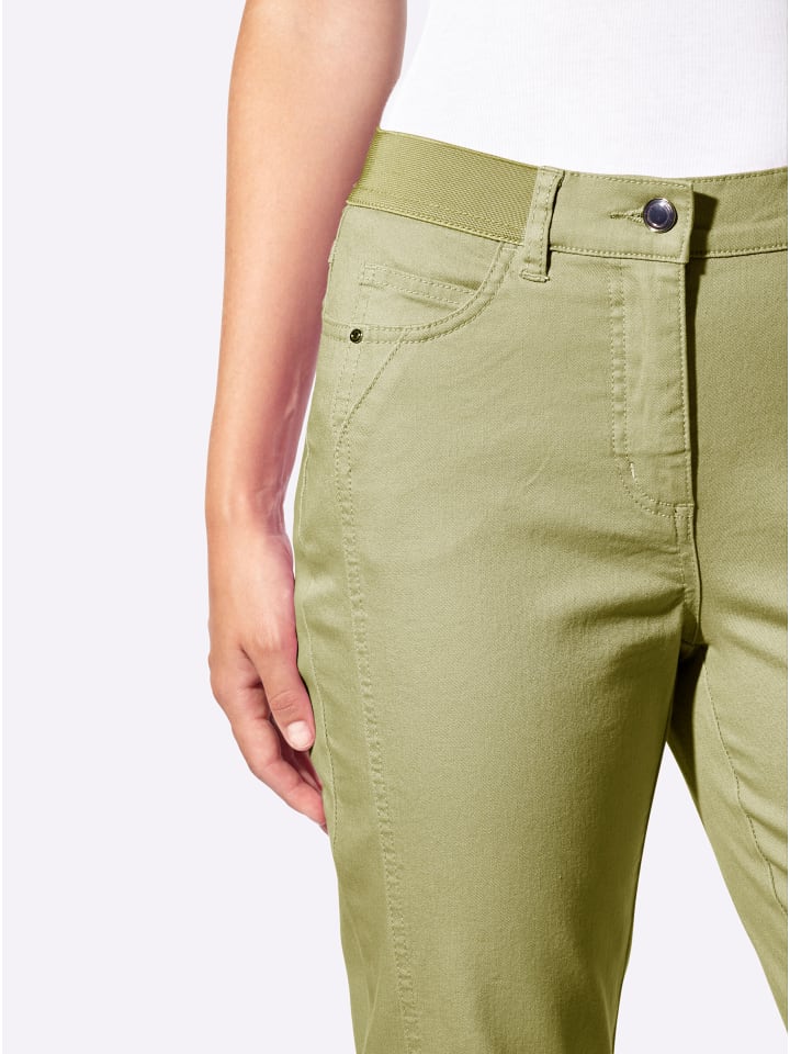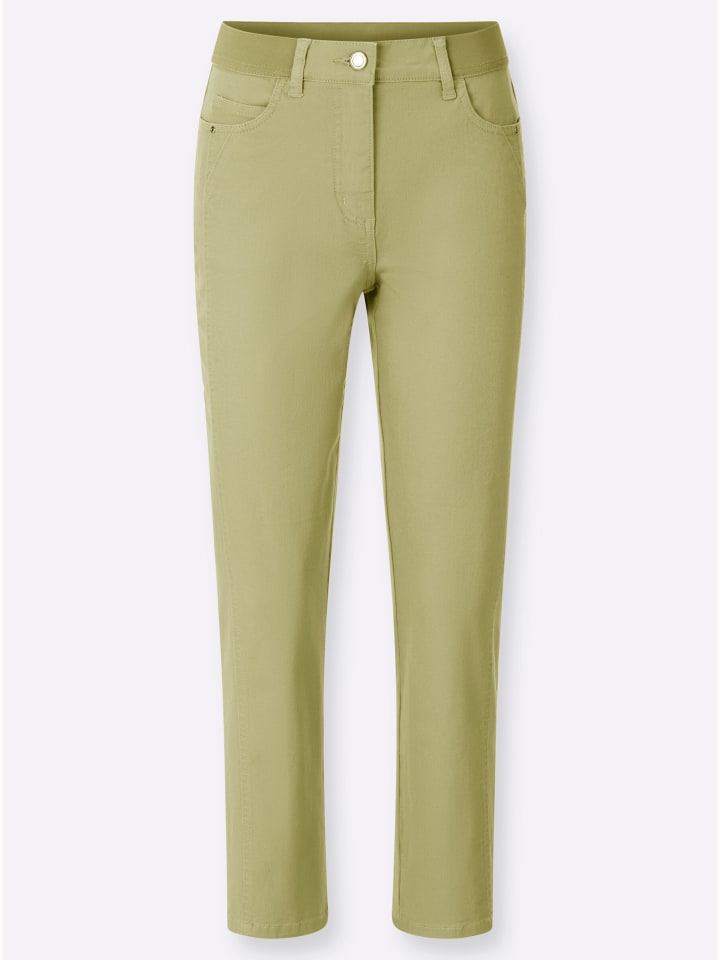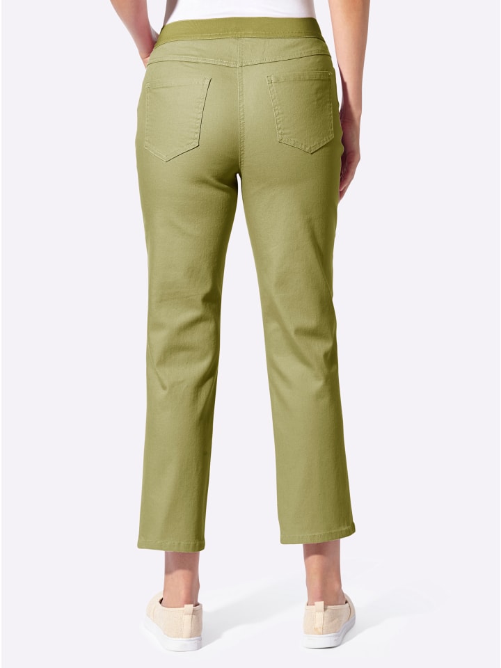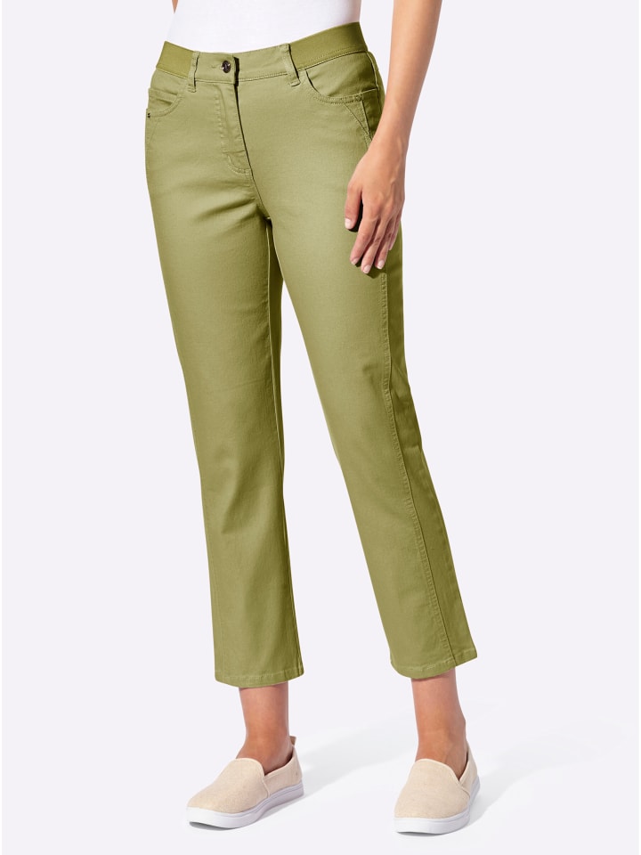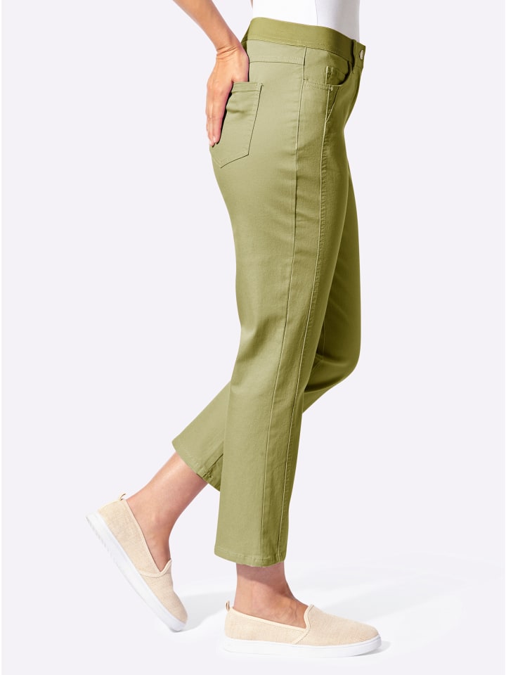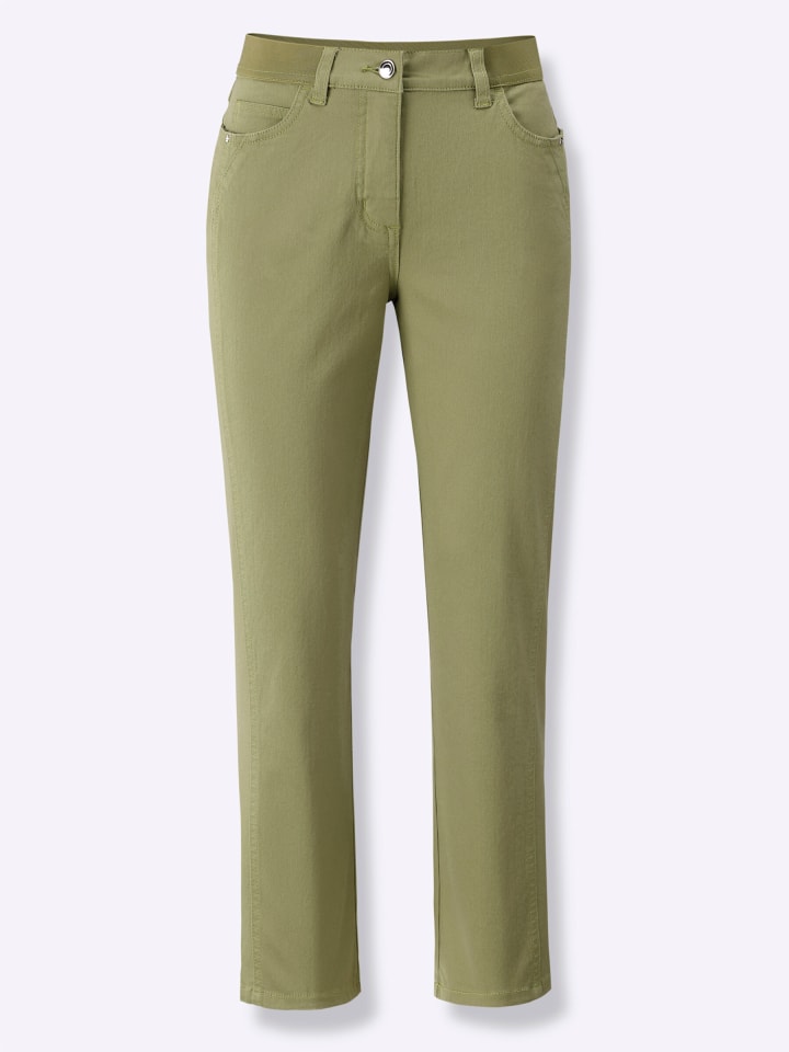 Очень удобные, супермодные: брюки 7/8 с ребристым эластичным поясом, гладкой передней частью, шлевками для ремня и застежкой на пуговицу и молнию. Классический крой с пятью карманами: 2 передних кармана, 1 карман для монет и 2 накладных кармана сзади. Боковой шов визуально удлиняет ногу. Длина брючины примерно 40 см. Ремень в комплект не входит. Соответствует инициативе «Сделано в Африке» из хлопка.