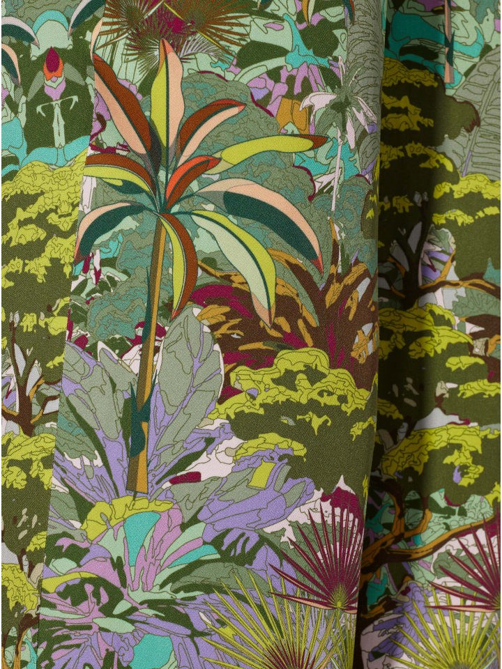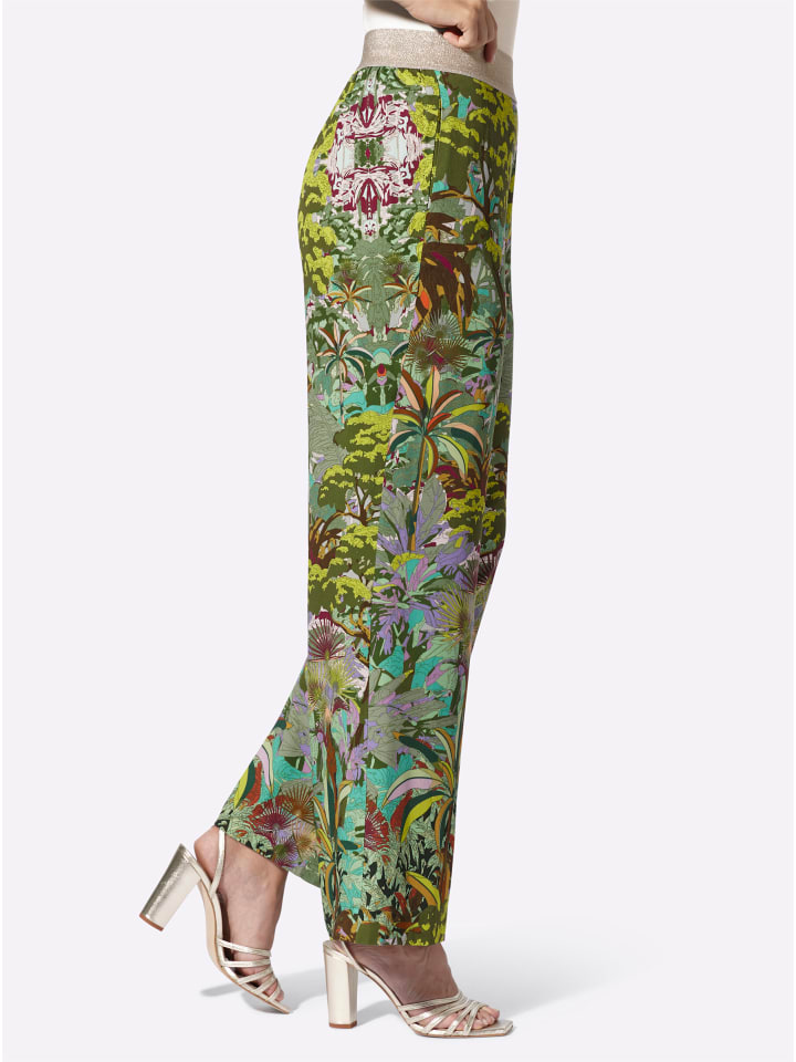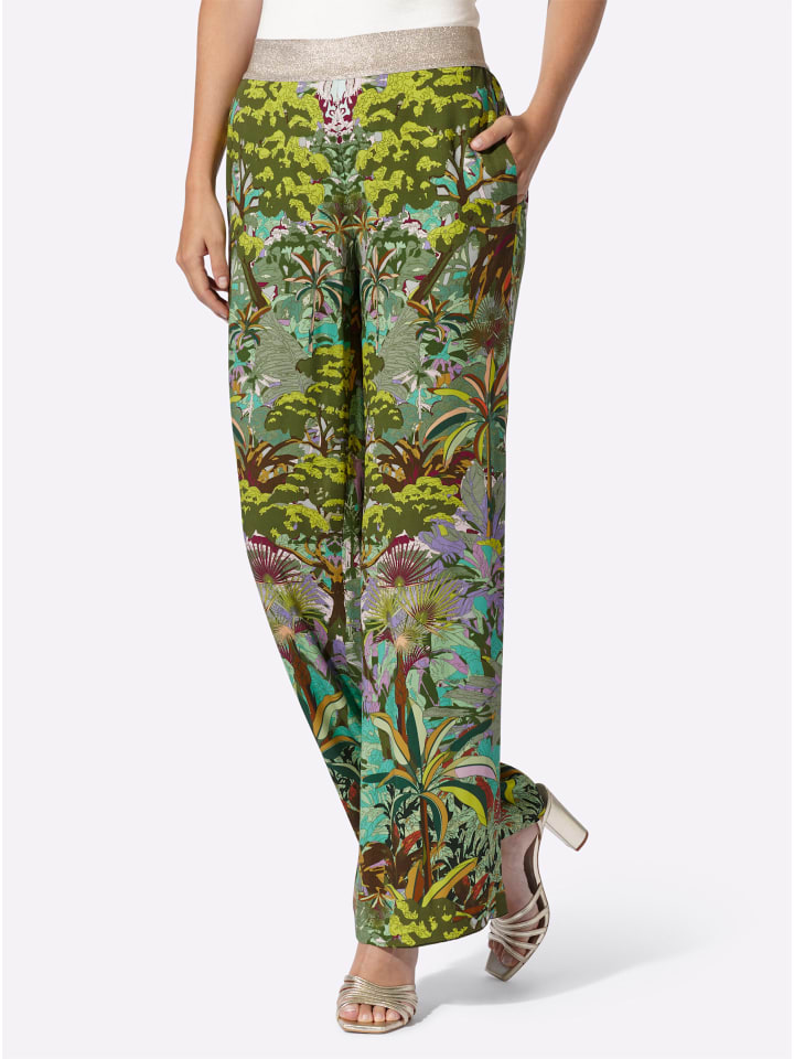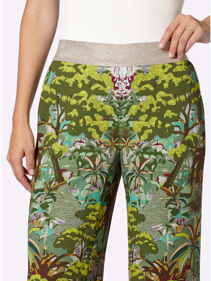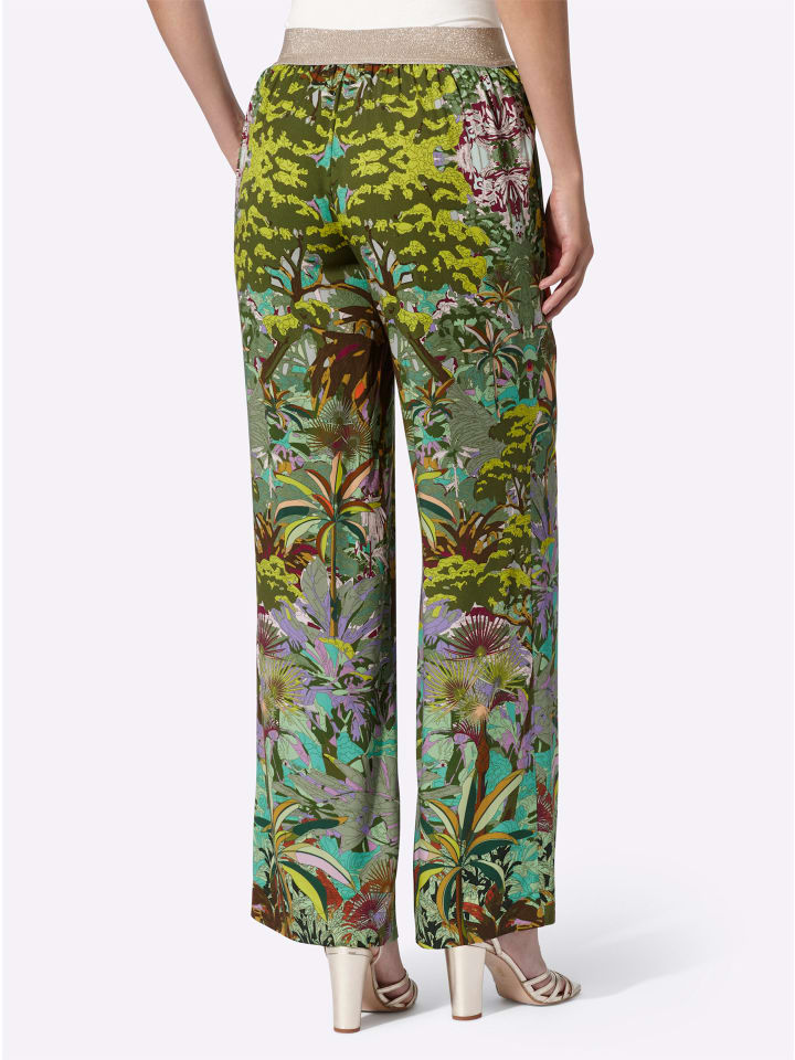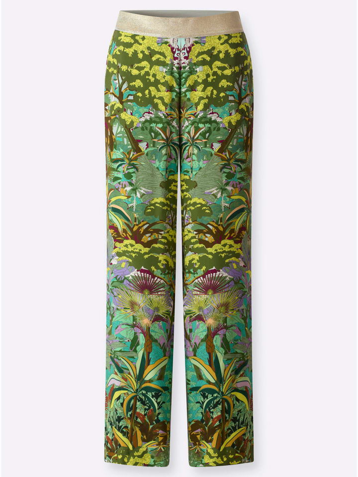 Брюки с принтом из мягкого, струящегося вискозного трикотажа ECOVERO от Lenzing. Экстравагантный дизайн в стиле джунглей. Удобный эластичный пояс с блестящей пряжей; карманы в швах. Прямой, широкий крой. Стандартная посадка. Комфортная посадка. Ширина брючины примерно 56 см.
